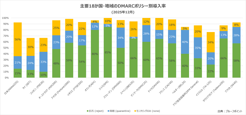 日経225企業のDMARC導入率は92%に達するも、詐欺メールを防ぐ有効設定は18か国中最下位