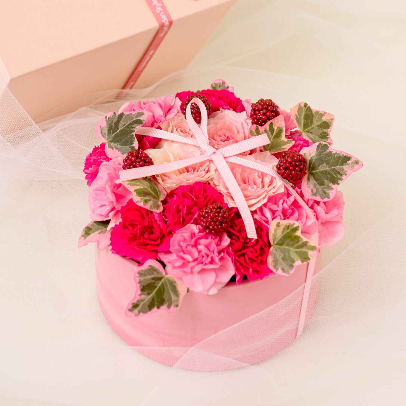 お花のケーキ・フラワーパティシエ。かわいらしいピンクのカーネーションとバラがぎゅっとつまったアレンジメント。まるで本物のケーキのようにあまい香りがただよってきそうなフラワーケーキはサプライズギフトにおすすめです。