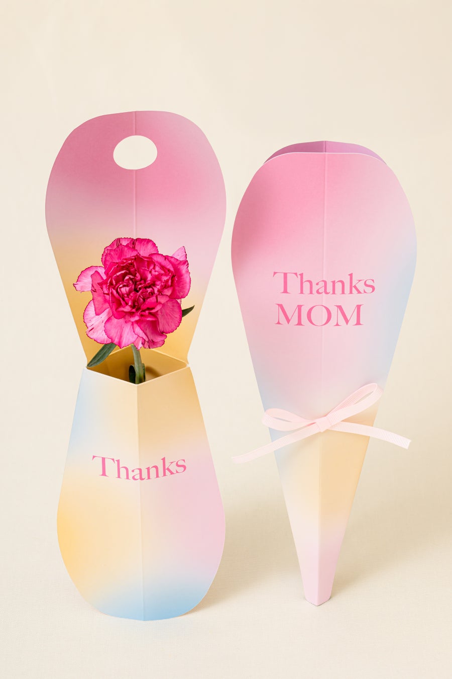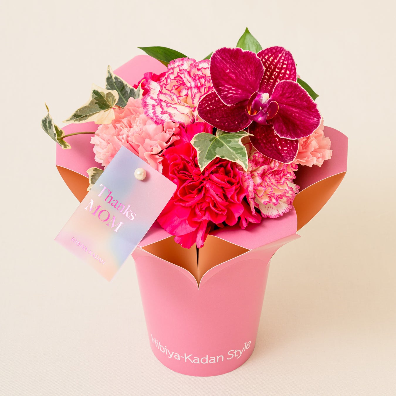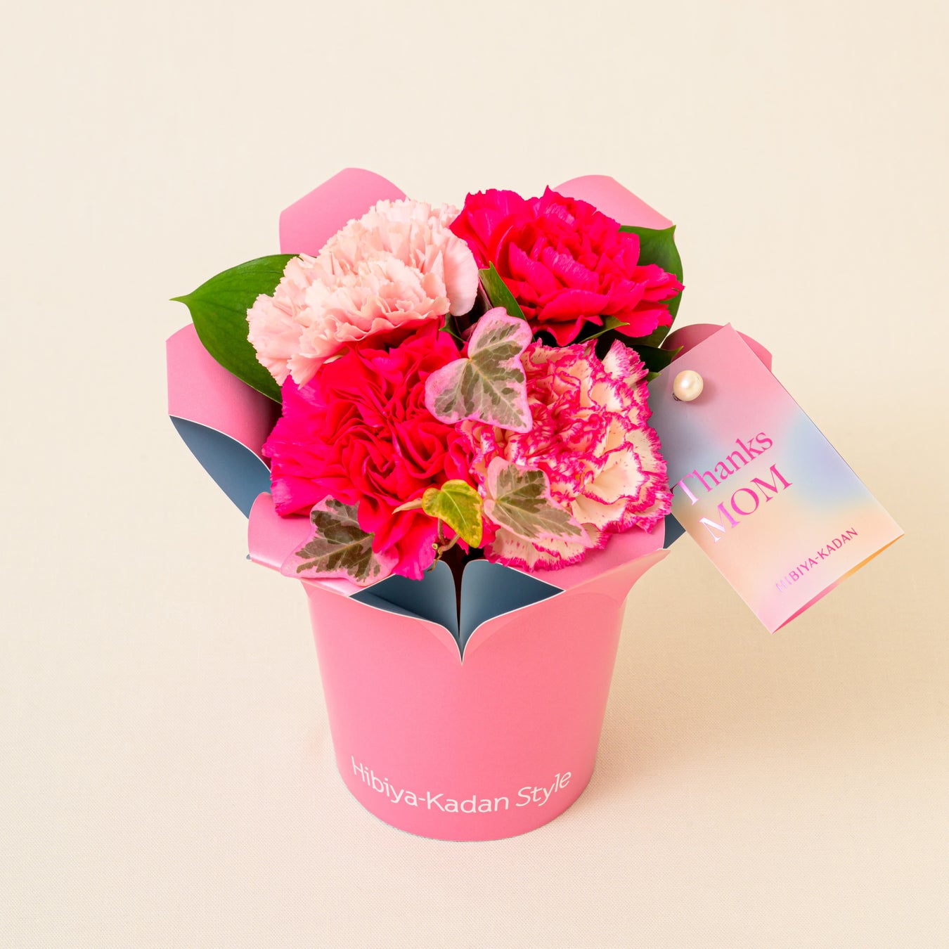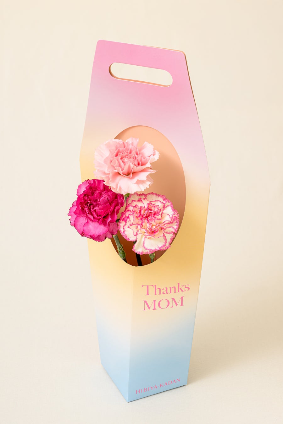 環境配慮はさることながら、花を花で包みこむような花びらを思わせるラッピングは、お母さんの笑顔を咲かせる可愛らしいデザインとなっています。母の日に贈りたい赤やピンク、オレンジのカーネーションに合う、ピンクと水色を基調とした母の日限定カラーでご用意しました。