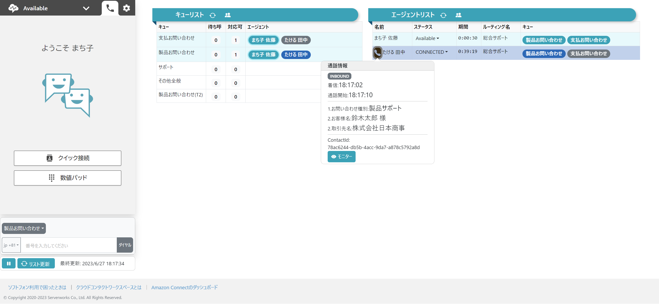 待機時間が長い順にエージェントが表示されるので、次に誰が着信するのかすぐに把握することができます。また、誰がどのようなステータスなのか確認が可能です。通話中の場合もコンタクト情報が確認でき、リアルタイムなモニタリングも可能になります。