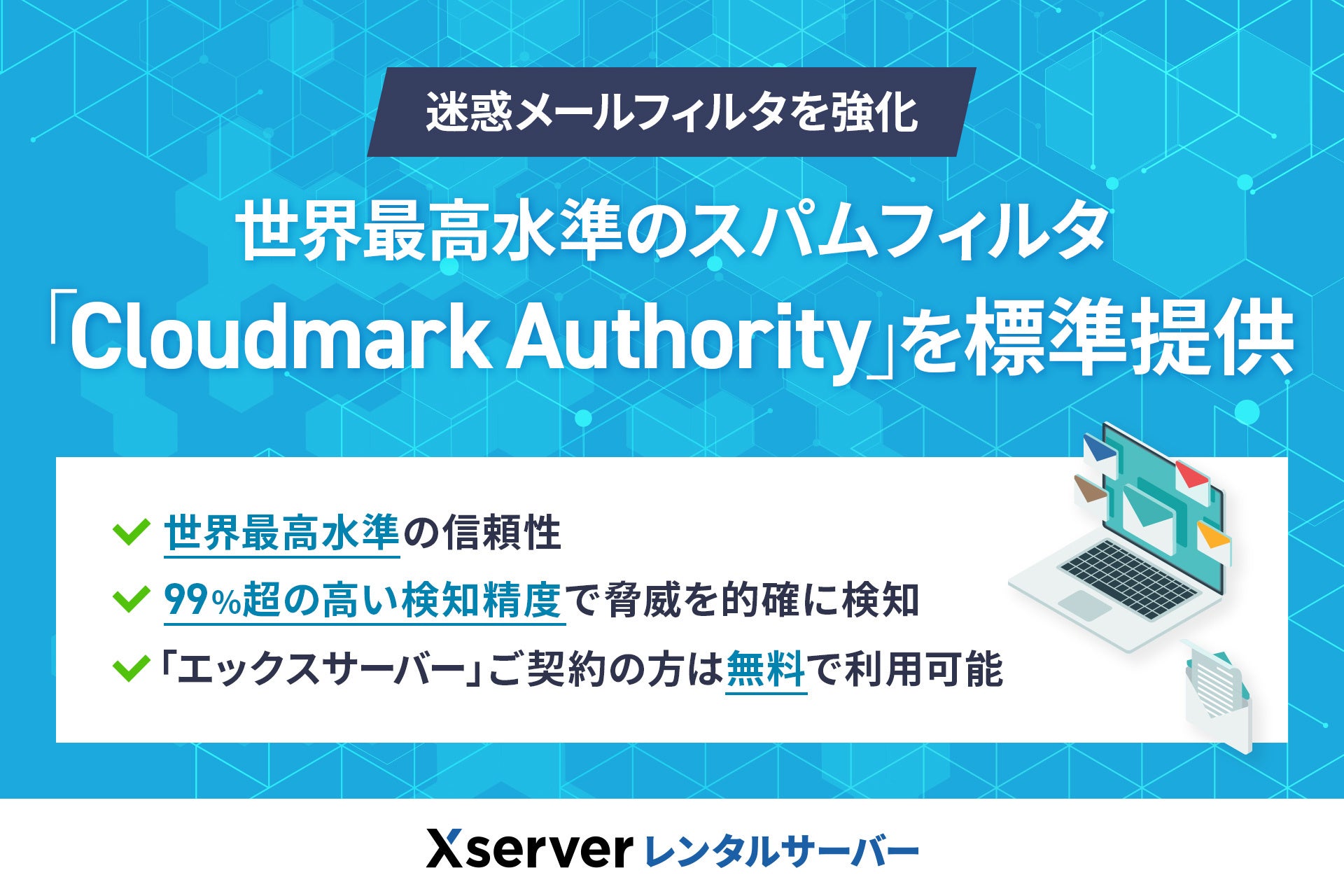 『エックスサーバー』では、「迷惑メールフィルタ設定(旧:迷惑メール設定)」機能を強化し、世界最高水準の検知精度を誇る高性能スパムフィルタ「Cloudmark Authority」を導入しました。