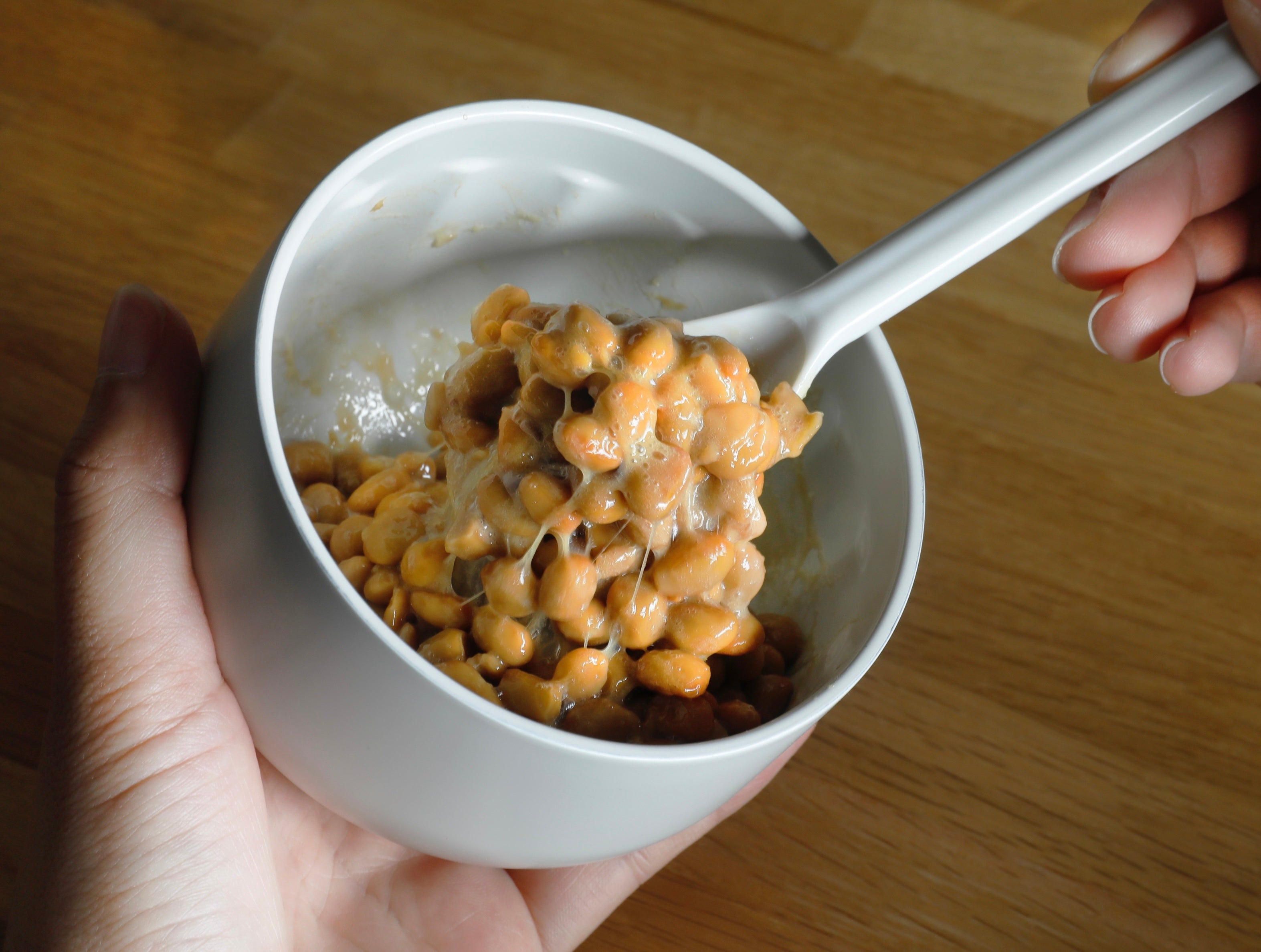 納豆は、30 ℃〜40 ℃で発酵が進みます。 発酵が過剰に進んでしまうと、アンモニア臭が発生したり、白く結晶化してしまうなど、食感や香り、味が落ちてしまいます。その為、過剰発酵が防げる冷蔵庫( 3℃〜6 ℃)で保存し、食べる時も「ひんやり」した状態で食べると、納豆を最も美味しく食べることが出来ます。