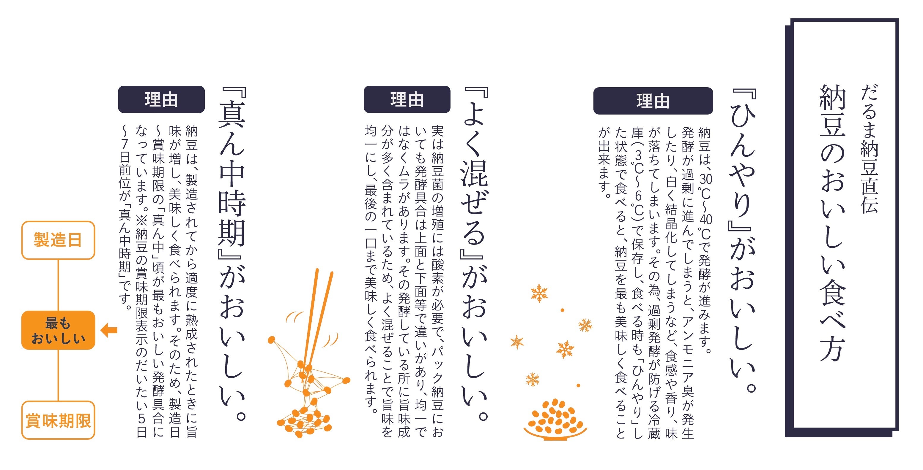 納豆は、製造されてから適度に熟成されたときに旨味が増し、美味しく食べられます。そのため、製造日〜賞味期限の「真ん中」頃が最もおいしい発酵具合になっています。※納豆の賞味期限表示のだいたい5日〜7日前位が「真ん中時期」です。