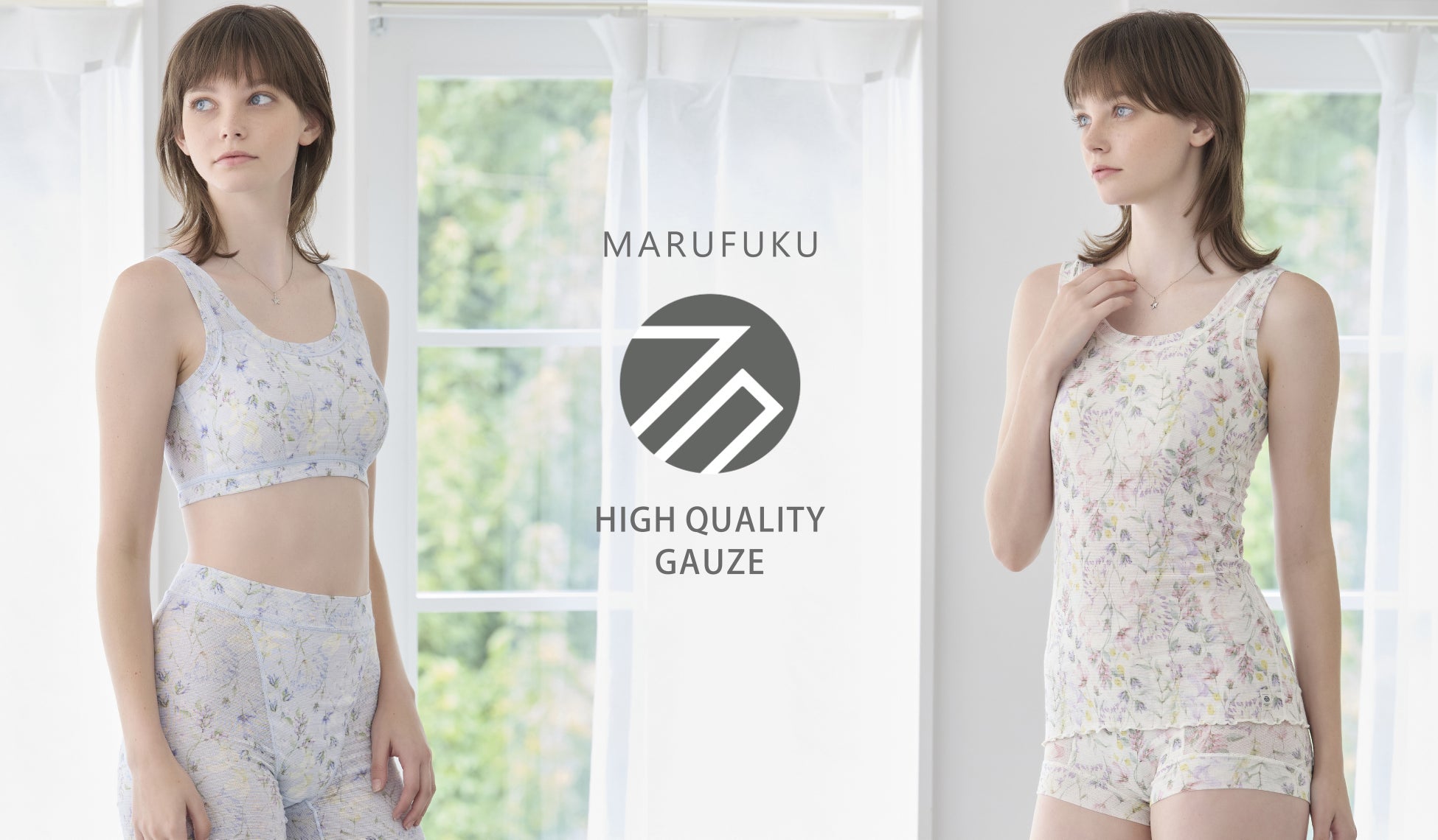 年1回新作を展開している『丸福ガーゼ』プリントシリーズは、毎年完売するほどの人気です。今年はカップ付きタンクトップ、ノンワイヤーブラ、ショーツ、3分丈ショーツを展開。繊細なフラワー柄で、カラーバリエーションはブルーコフレ、ホワイトブーケ、シックグレーの3色。植物由来のモダール(レーヨン)と綿を合わせた“綿モダール”を65%使用した、やわらかくしなやかな風合いで着心地は抜群。シルクタッチの特殊なナイロン糸を30%用いることによって、よりやわらかく軽やかな着心地で、速乾性にもすぐれています。汗をかいてもムレにくく、嬉しい抗菌防臭機能付き。気温差や汗冷えが気になる時期も快適に過ごせます。