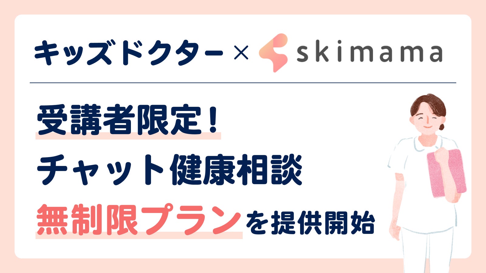 そこでオンライン診療アプリ「キッズドクター」は、ママ向け在宅支援スクール「skimama」のご受講者様に向けて、キッズドクターのチャット健康相談が無制限(通常3ヶ月に3回まで)で利用できるプランを提供いたします。病院が開いていない夜間に、子どもの健康や体調について看護師に何度でも相談することが可能です。