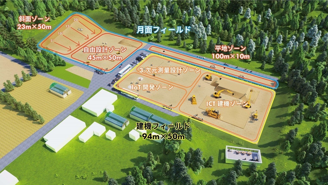 ・フィールドの潜在ユーザーの声をもとに設計。月面環境を想定した実証実験を行うための平面ゾーン、斜面ゾーン(5度~20度程度)、自由設計ゾーン(利用者が自由に掘削・造成可能)から構成。
