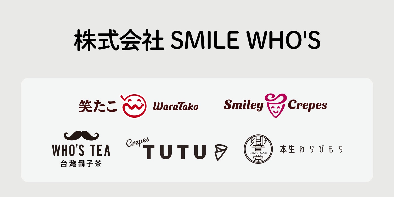 本合併により、3社が運営する関西風たこ焼き店「笑たこ」、クレープ専門店「スマイリークレープ」、クレープ&ドリンク専門店「TUTU」、台湾発祥のグローバルティーカフェ店「WHO’S TEA」、本生わらび餅など和スイーツ専門店「響堂」という5ブランドがひとつの企業のもとに統合され、ブランド間の連携をさらに強化しながら、お客様にさらなる“食の楽しみ”を提供いたします。新会社「株式会社SMILE WHO’S」では、それぞれの既存ブランドが培ってきた魅力や強みを活かしながら、より強固な経営基盤と商品開発力をもとに、さらなるサービス向上と店舗展開を目指してまいります。