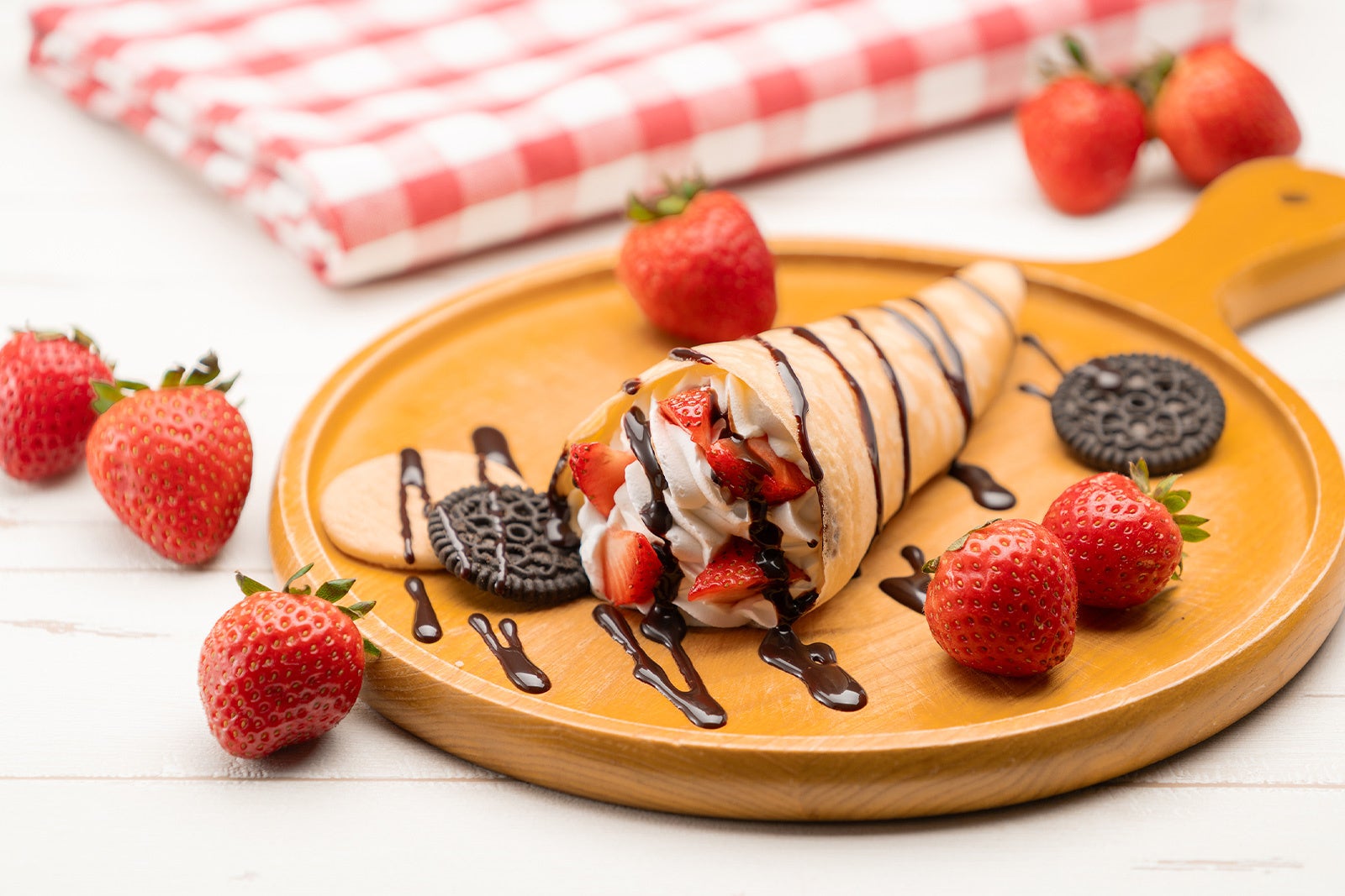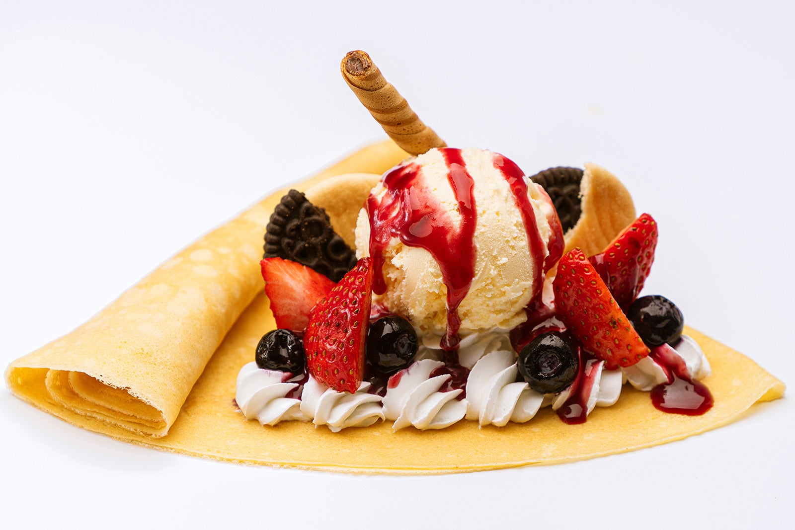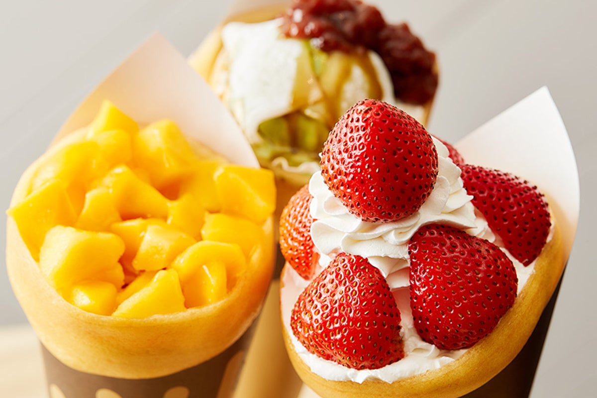 クレープ専門店『スマイリークレープ』は、採れたてのみずみずしいフルーツを、水を使用せず牛乳、卵、バターで作るしっとりなめらかな食感の生地で包み込むふんわりやさしいクレープが特徴です。厳選された素材を使用し、丁寧に一枚一枚焼き上げたクレープ生地に、フルーツやアイスをボリューミーにトッピングしてご提供。フルーツや生クリームを使った定番のスイーツ系はもちろん、ホットクレープや季節限定のメニューなど、約40種類のクレープメニューをご用意しております。