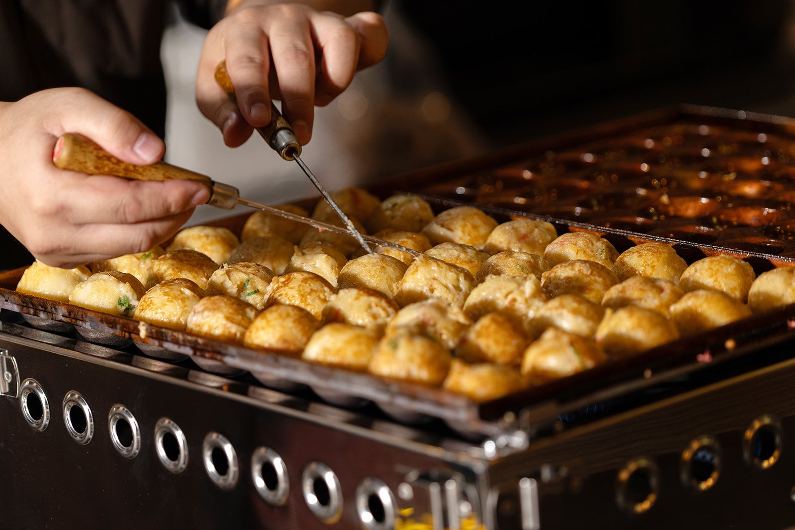 関西風ふわとろ食感が楽しめる『笑たこ』は、熟練の技術で油で揚げずに焼き上げたヘルシーなたこ焼きが特徴です。本場関西の「ふわっ」「とろっ」の食感にこだわり、蛸、粉、葱、水など使用する全ての食材を厳選。最低限の油でカロリーを抑え、身体にやさしく表面はさくっと、そして中は熱々トロトロの食感が楽しめます。人気の商品『塩ねぎマヨたこ焼き』や女性に人気の『明太マヨたこ焼き』の定番メニューから、期間限定の味まで、バラエティ豊かなメニューをご用意しております。