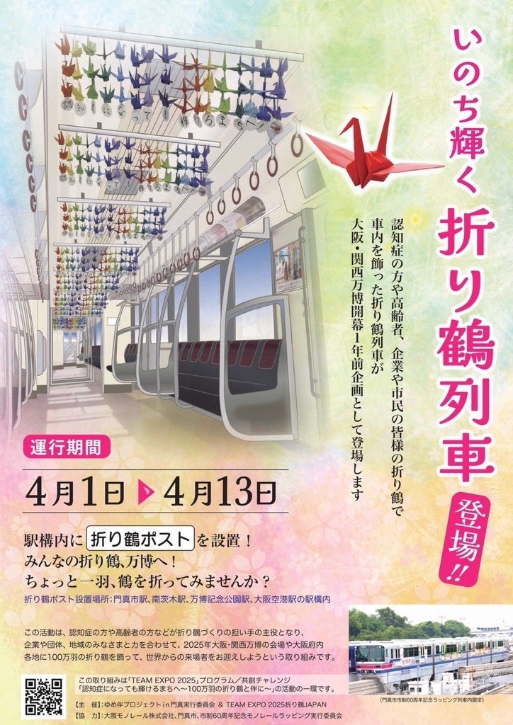 ゆめ伴(とも)プロジェクトin 門真実行委員会が取り組む「TEAM EXPO 2025」プログラム/共創チャレンジ「認知症になっても輝けるまちへ~100万羽の折り鶴と伴に~」を広く社会に発信することで、大阪モノレールにご乗車される多様な方々に大阪・関西万博のテーマである「いのち輝く未来社会のデザイン」を体感していただき、その理解と共感を深めてもらうため、企画したものです。
