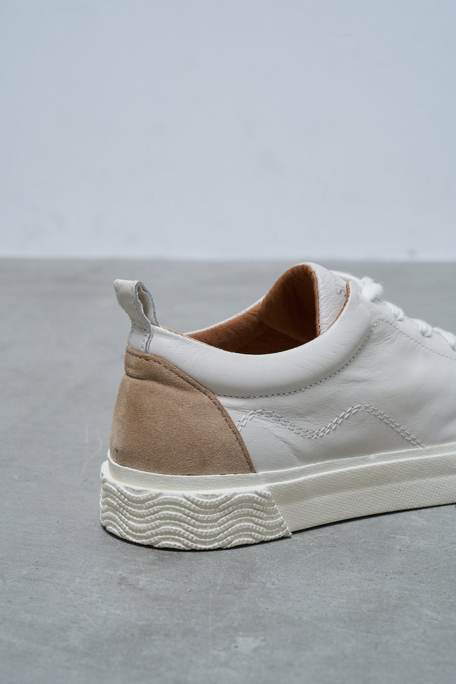 ヒールガードにもNo.8アウトソールの意匠、アッパーのヒール部分はスエード素材に切替えてデザイン上のアクセントに。シンプルな見た目ながら細部にいたるまでこだわりが詰まったコートスニーカーです。