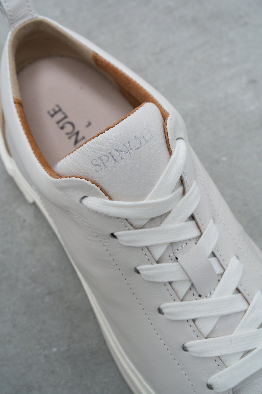 アッパーにはブランドのアイコン素材とも言える、軽量かつしなやかなカンガルーレザーを使用。シンプルな外羽根デザインのため、シュータンに箔押ししたブランドロゴ、サイドに施したSPINGLEの巻き上げソールを模したステッチがデザインのアクセントになっています。