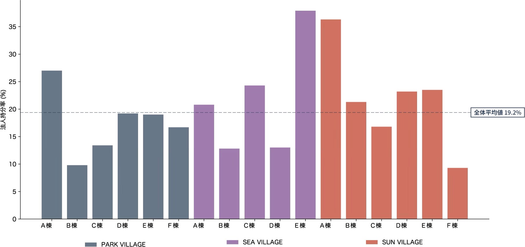 複数の住戸を所有する所有者のうち、最大で29戸を保有する法人が確認されました。調査対象全体の19.2%を法人が保有しており、一部の棟では30%以上を法人が占めていることがわかりました。