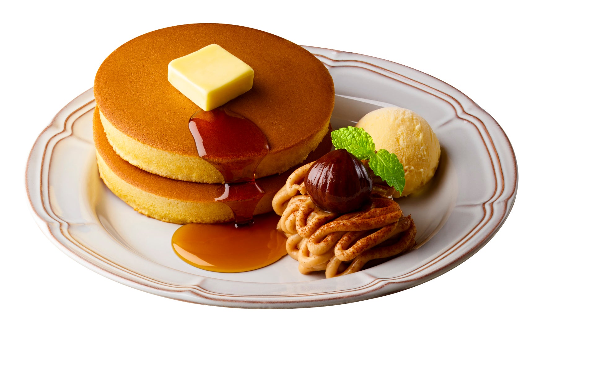 「モンブランホットケーキ」は専用の銅板で丁寧に焼き上げた『珈琲館』の看板メニュー”トラディショナル・ホットケーキ“の秋限定バージョン。イタリアンマロンクリームに渋皮栗をのせモンブラン仕立てにし、バニラアイスと共に添えた一品です。珈琲との相性も良く、秋の味覚を存分に楽しめる贅沢なホットケーキです。