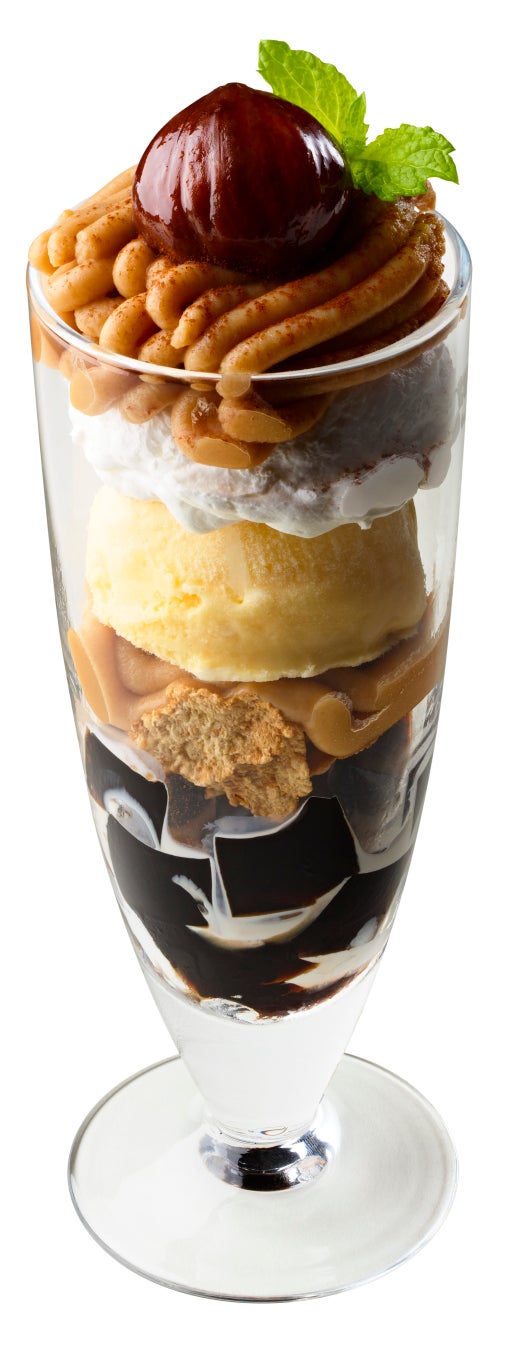 「マロンのシンフォニー」はお店手作りのオリジナル炭火珈琲ゼリーに、ホイップクリーム、玄米フレークやバニラアイスを重ね、イタリアンマロンクリームをたっぷりと絞り、パフェ仕立てにしました。食べ進める毎に味わいの変化をお楽しみいただけます。