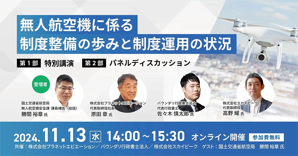 ドローンの関連許認可申請とソリューション開発を専門とするバウンダリ行政書士法人(本社:東京都千代田区、代表行政書士:佐々木 慎太郎)は、株式会社スカイピーク(本社 : 東京都渋谷区、代表取締役 : 高野 耀)および株式会社プラネットエビエーション(本社 : 神奈川県横浜市、代表取締役 : 原田 章)と共同で、無料ウェビナー「無人航空機に係る制度整備の歩みと制度運用の状況」を2024年11月13日に開催いたします。