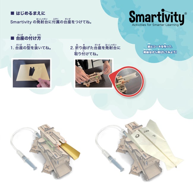 また、「Smartivity 水の力で飛ばす飛行機発射台」を使ってより上手に飛ばすために、発射台の台座も開発しました。本商品に付属しているので、すぐに発射台に取り付けて遊ぶことができます。