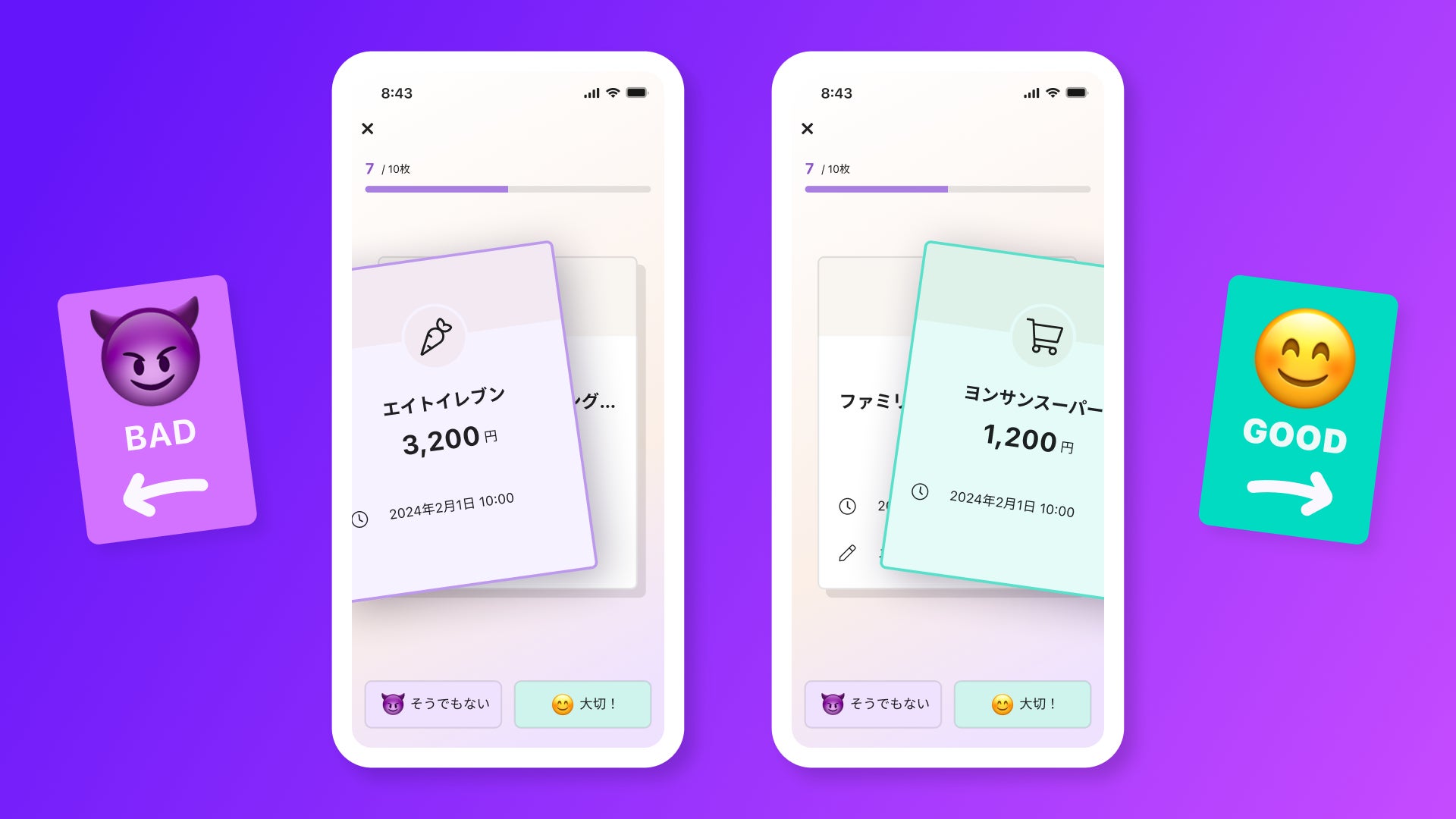 ユーザーが自分自身の支出を振り返りながら、「あなたにとって大切なもの(Goodな支出)」と「必要でないものや後悔したもの(Badな支出)」を直感的に分類していくことにより、AIがお金の使い方の好みを学習します。