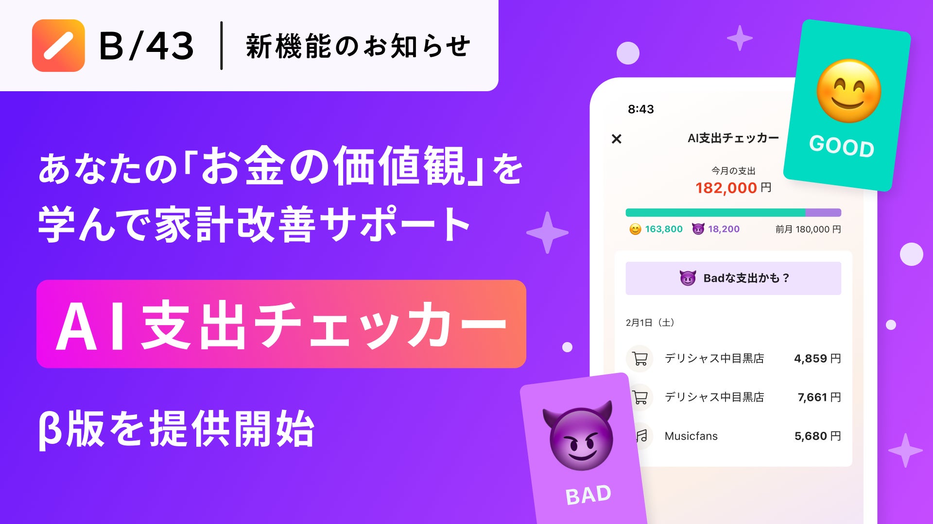 家計管理サービス「B/43」、ユーザーのお金の価値観を学習し家計改善を支援する「AI支出チェッカー」ベータ版を公開