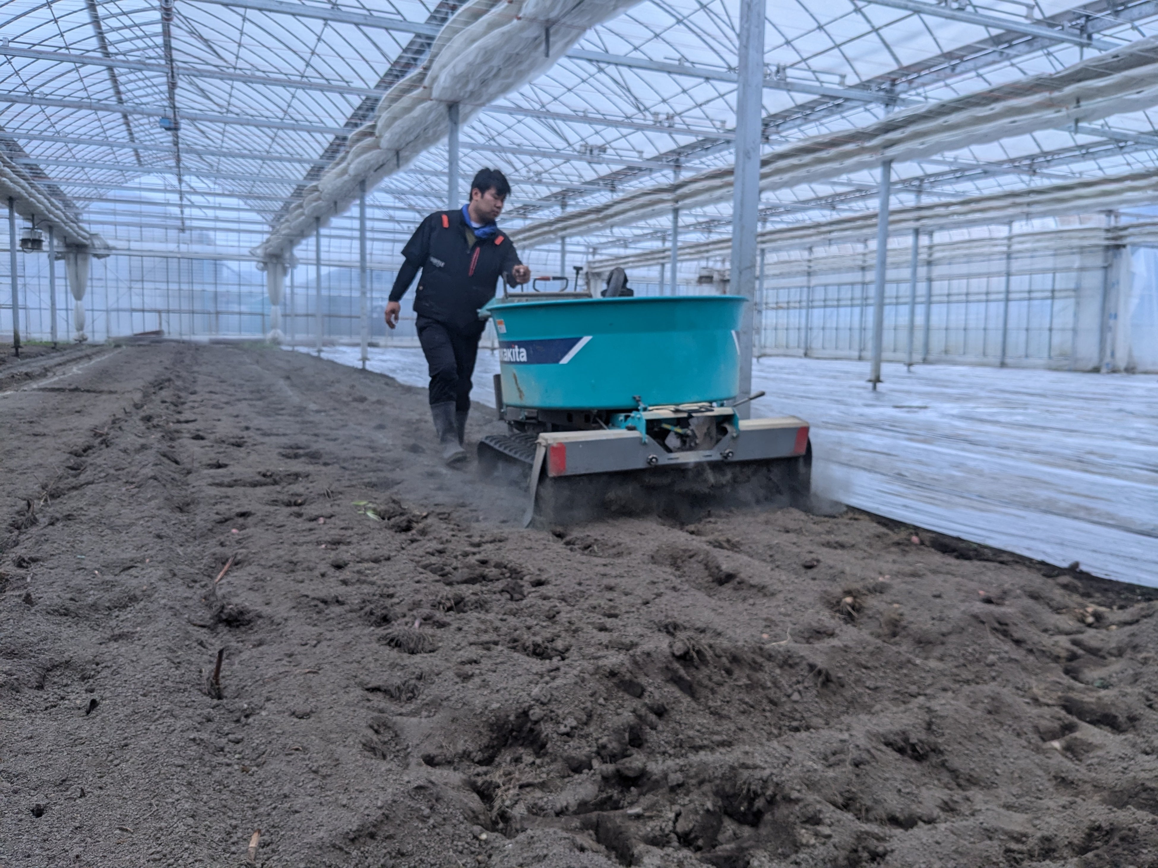 エフ・エフ・ヒライデは、以前より花き生産における土づくりにこだわり、化学農薬に頼らない土壌消毒や燃油使用量の抑制など環境負荷低減に取り組み、国際的な花き産業の環境認証システム「MPS-ABC」のAランクおよび、日持ち生産管理切り花(切り花JAS)を国内で初めて取得するなど先駆的な栽培を実践してきました。この度新たな取り組みとして、土づくり期間の短縮・化学肥料使用の低減・土壌への炭素固定を実現する高機能バイオ炭「宙炭」を導入しました。2025年10月および12月の2回にわたり、圃場へ計2,080Lの宙炭およびバイオ炭を施用。定植以降順調な生育を確認しており、宙炭の生育促進効果を実感いただいています。