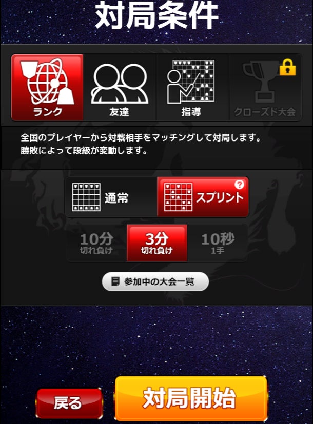 2.対局条件画面で「スプリント」を選択して「対局開始」ボタンを押すと対局が可能です。