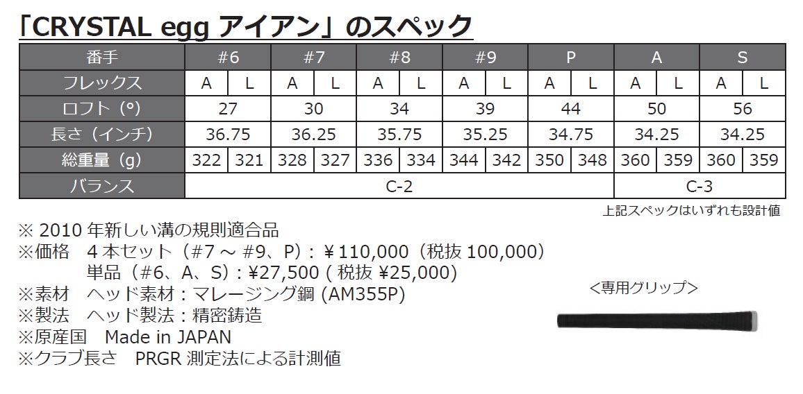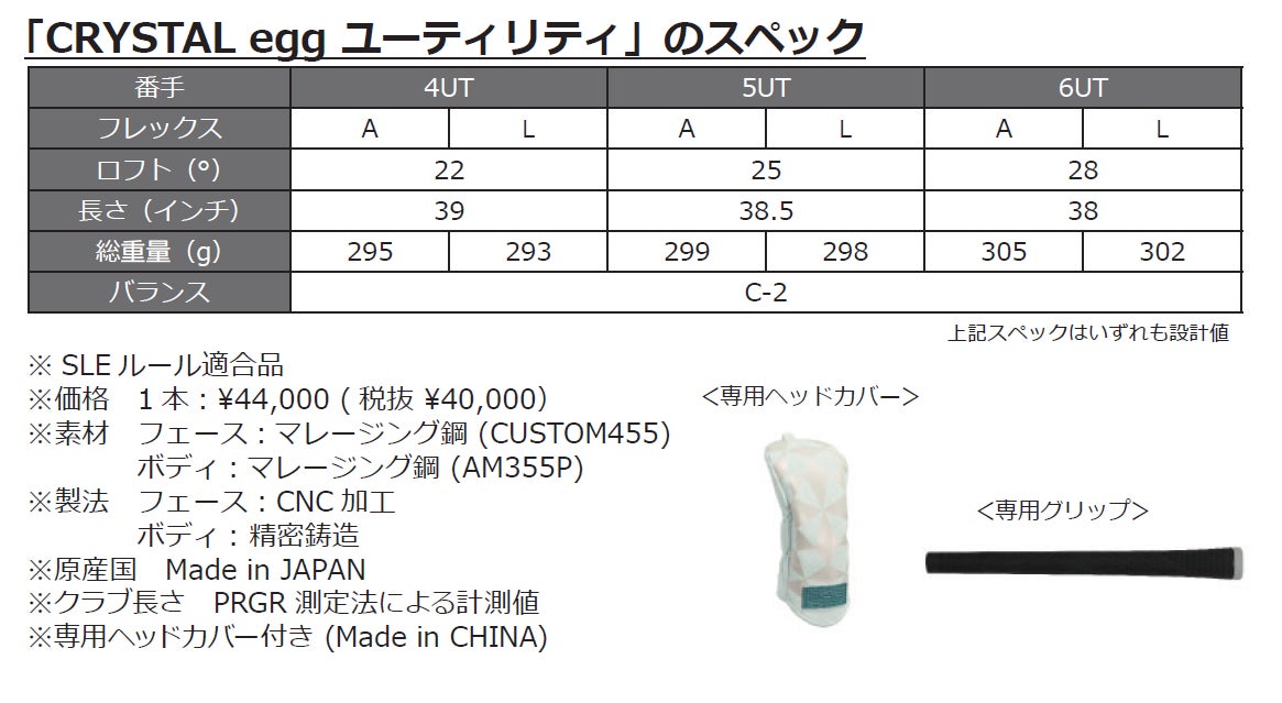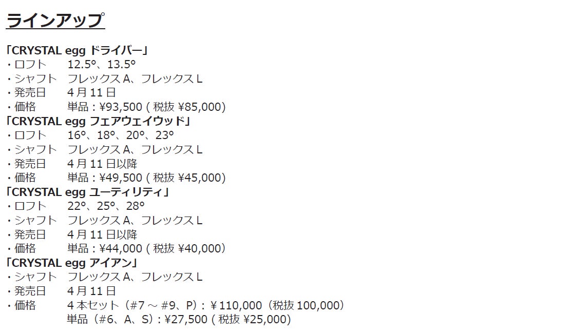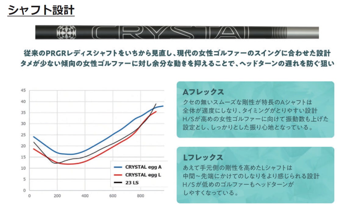 (株)プロギアは、"やさしくドローボールが打てる"をコンセプトに⼥性ゴルファーのスイングを徹底的に分析し創り上げた「CRYSTAL egg (クリスタル・エッグ)」シリーズを4 ⽉11⽇から順次発売します。のべ200⼈の⼥性ゴルファーの声と試打テストの結果を集約し専⽤設計したドライバー、フェアウェイウッド、ユーティリティ、アイアンをラインアップします。