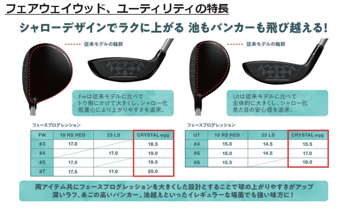 フェアウェイウッドとユーティリティは、シャローデザインで低重⼼化を図るとともに、フェースプログレッションを⼤きく設計。ボールの上がりやすさを追求したことで深いラフ、あごの⾼いバンカー、池越えといったイレギュラーな場⾯でも強い味⽅になるクラブに仕上げています。またドライバー同様、クラウンの「CRYSTAL MARK」がテークバックをアシストします。