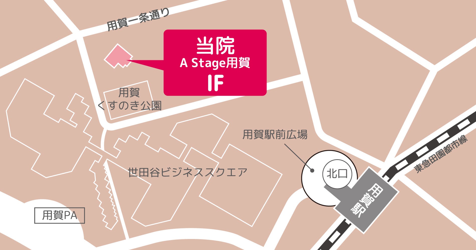 東急田園都市線「用賀駅」北口 徒歩約4分の「Astage用賀」1階で、朝9時から夜21時まで、土日祝日も毎日診療を行います。