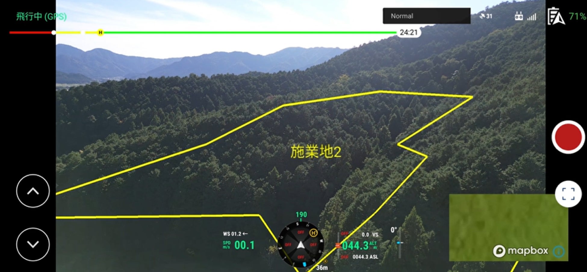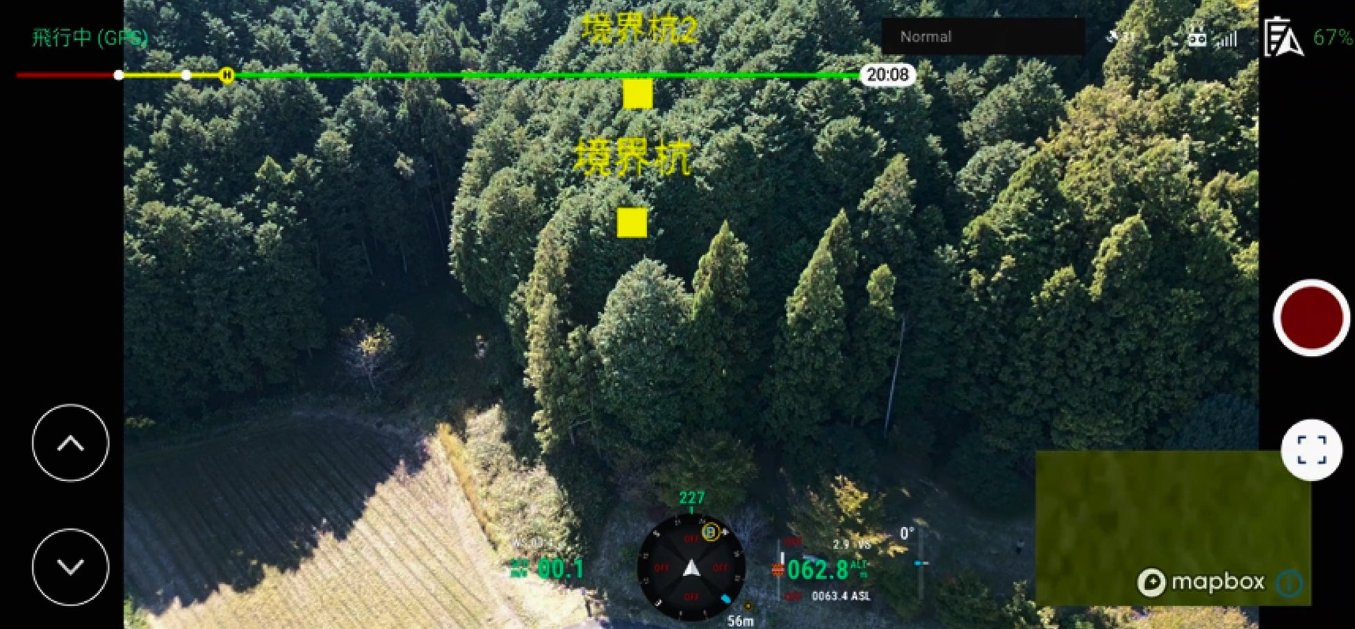 小型カメラドローンDJI mini3 Proを利用し、GISデータ(ライン、ポリゴン、ポイントデータ)のAR投影が可能です。mapry林業などで測量した周囲測量のエリアや境界杭の位置を、ドローンを操作しながら上空からの視点で再現します。撮影したデータは、動画のほか撮影日時込みの画像として保存が可能です。間伐・再造林などの施業地の確認、境界の確認にご利用いただけます。