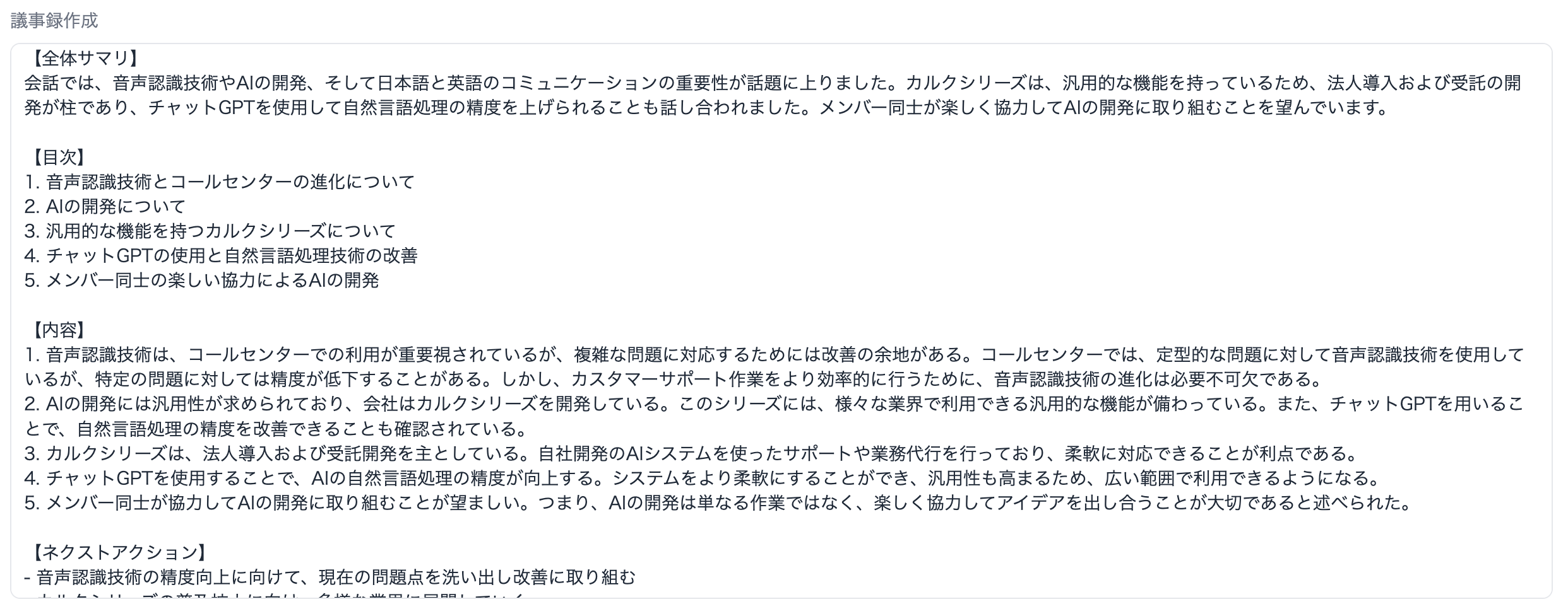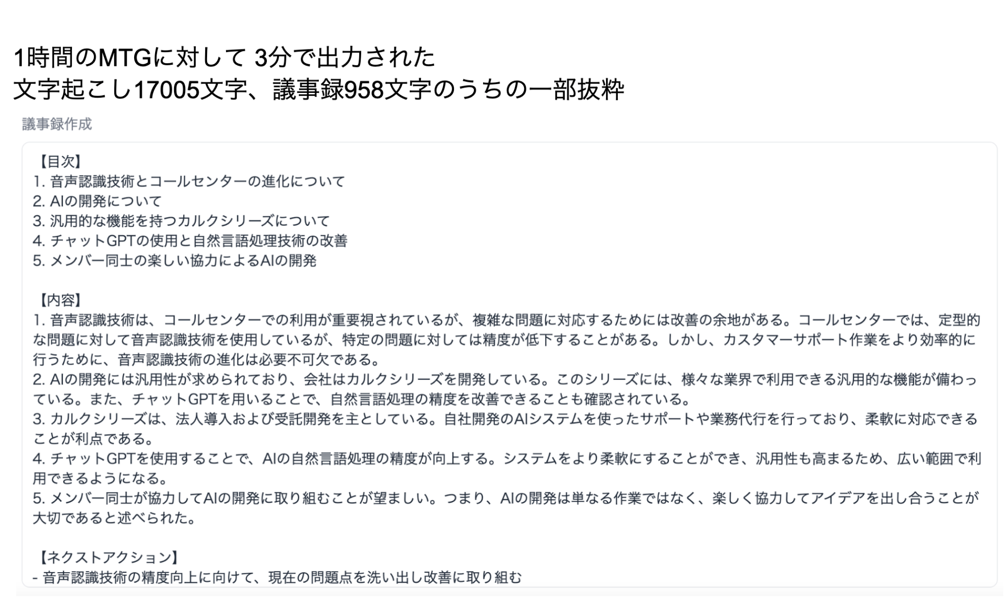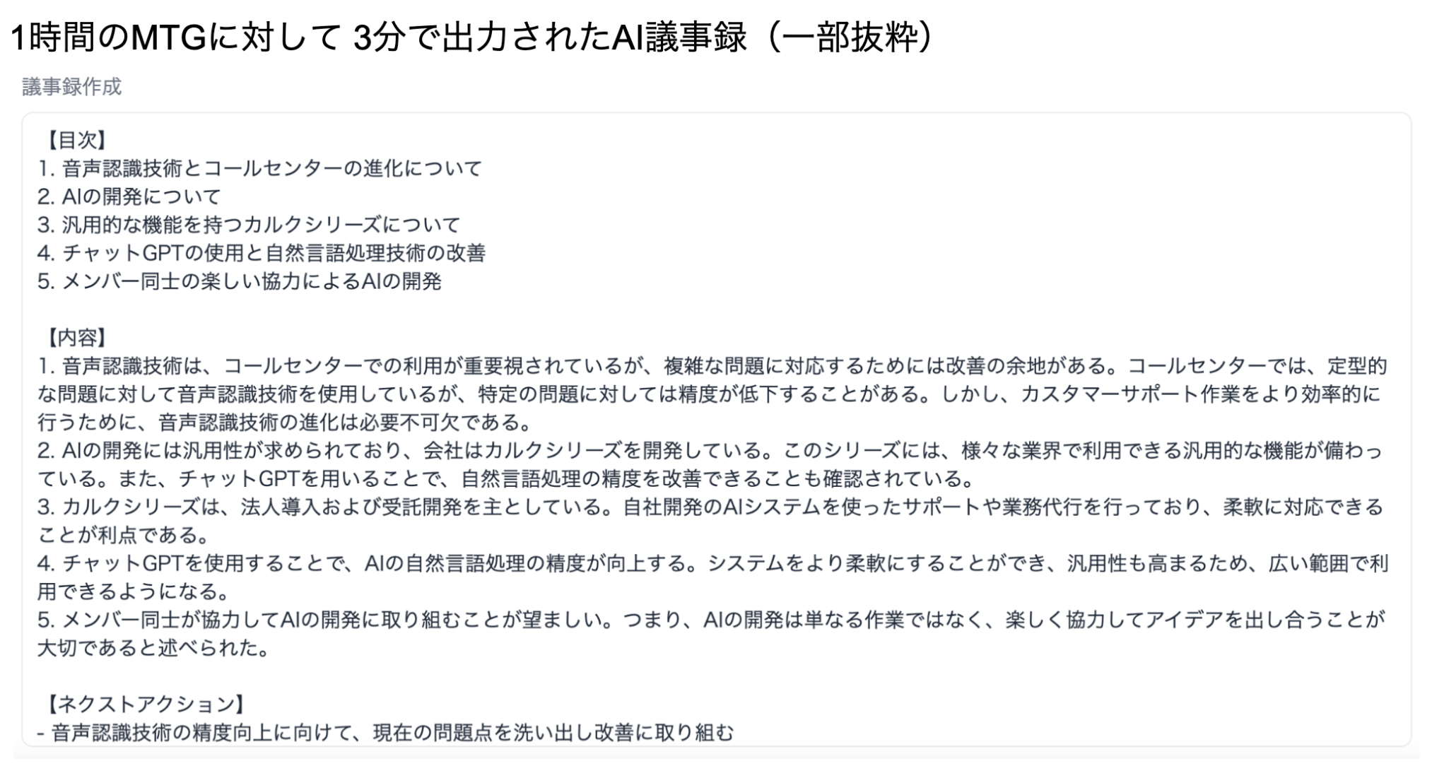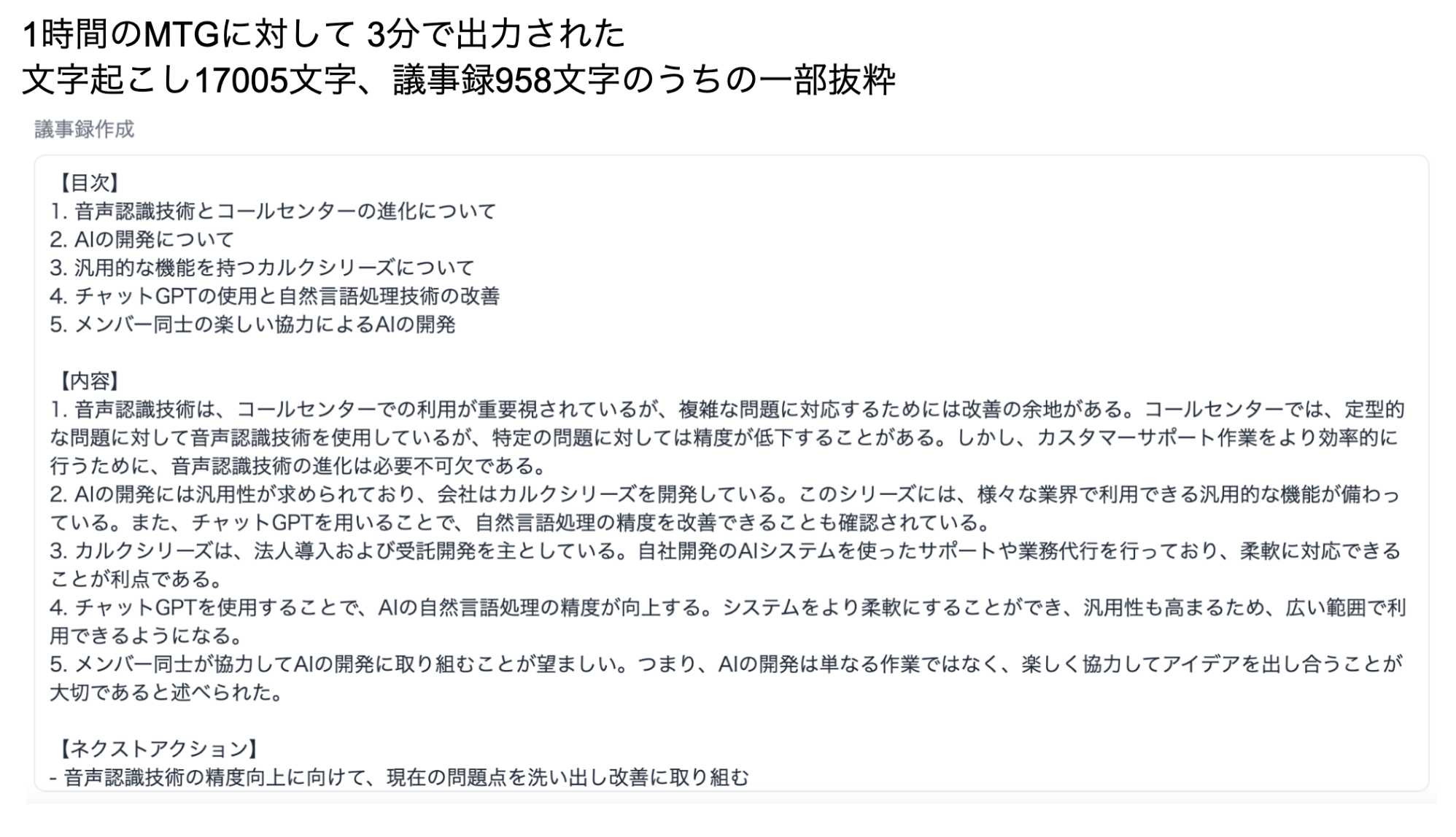 1時間のMTGを3分でAI議事録(サマリ、目次と構造化、ネクストアクション提案)を作成