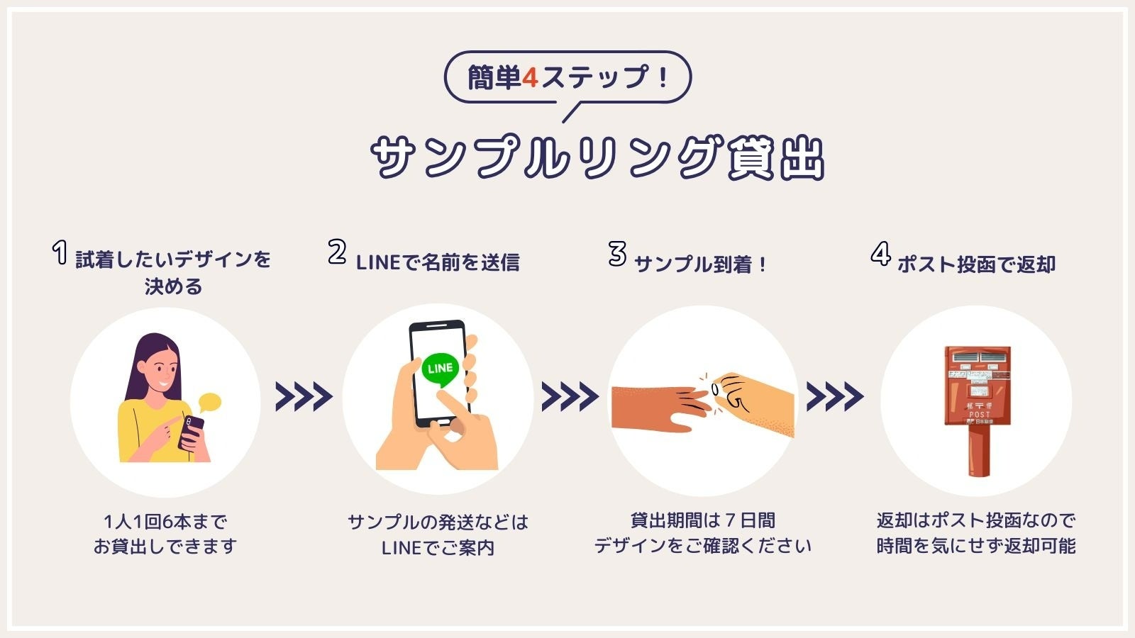 「一生物の結婚指輪を、実物を見ずにネットで買うのはちょっと不安」――そんな声にお応えし、最大6本のリングサンプルを無料(※デポジット制)でご自宅にお届け。