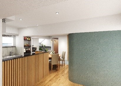 リビングには緩やかな曲線が特徴的なグリーンの塗り壁を設置。木目の床やキッチンとも相性の良い、ナチュラルなデザインです。
