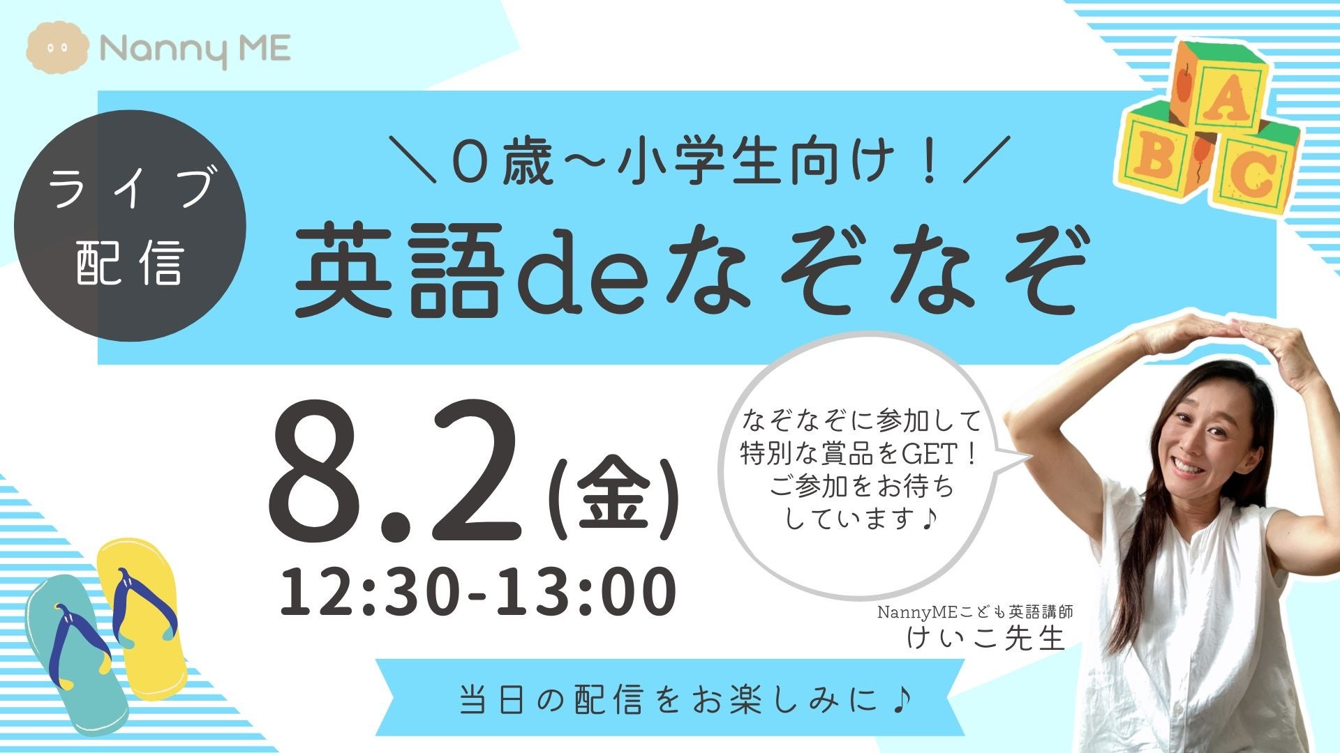 オンラインレッスン/オンライン保育「NannyME」(運営:株式会社七色、代表取締役CEO:佐々木綾香)の公式Instagramアカウント(@nannyme_official)と、公式TikTokアカウント(@nannyme79)にて、2024年8月2日(金)12:30より、人気英会話講師・けいこ先生によるライブ配信「お子さん向け!英語deなぞなぞ」が開催されます。