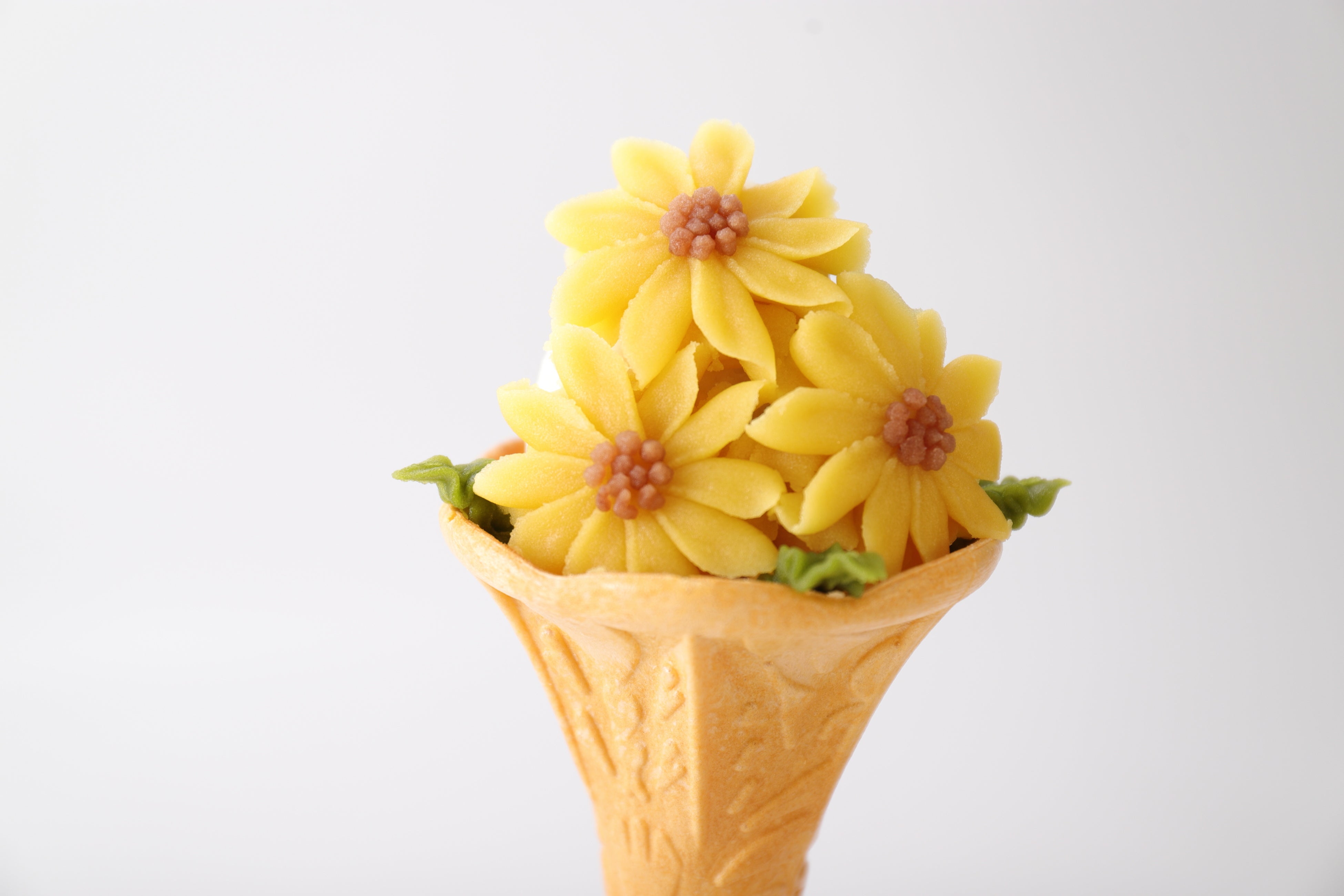 ・和の風味を楽しむ3種のアイスと、お花のデザインが華やかな軽やかコーン