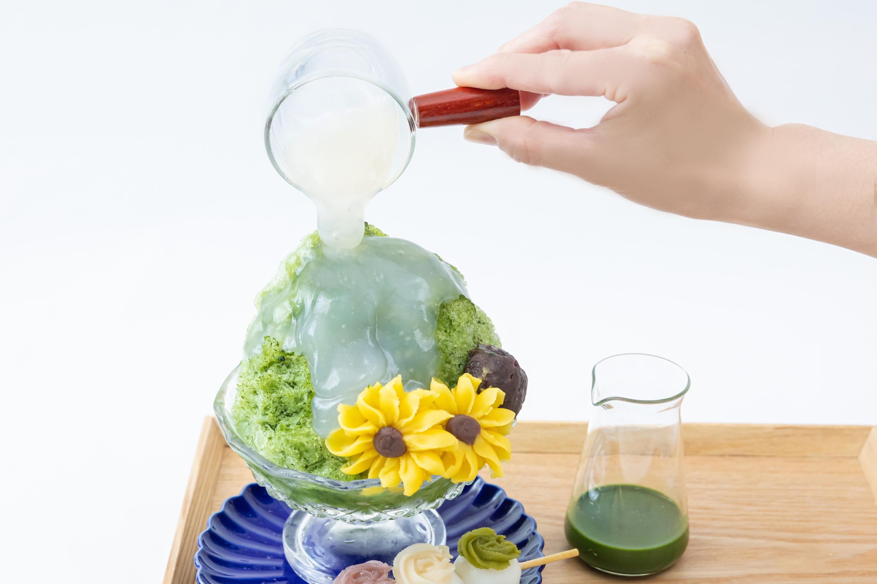 48時間かけて丹念に仕上げた高純度の氷柱を使用した本格かき氷は、一口ごとに口の中で優しく溶ける食感をお楽しみいただけます。さらに、自家製の濃厚いちごソースをたっぷりとかけた氷の上にたっぷり生クリームをのせて、その上に餡で絞ったお花もトッピング。とろけるわらび餅をかけていただくお味は絶品です。味だけでなく、見た目も美しい贅沢なかき氷です。