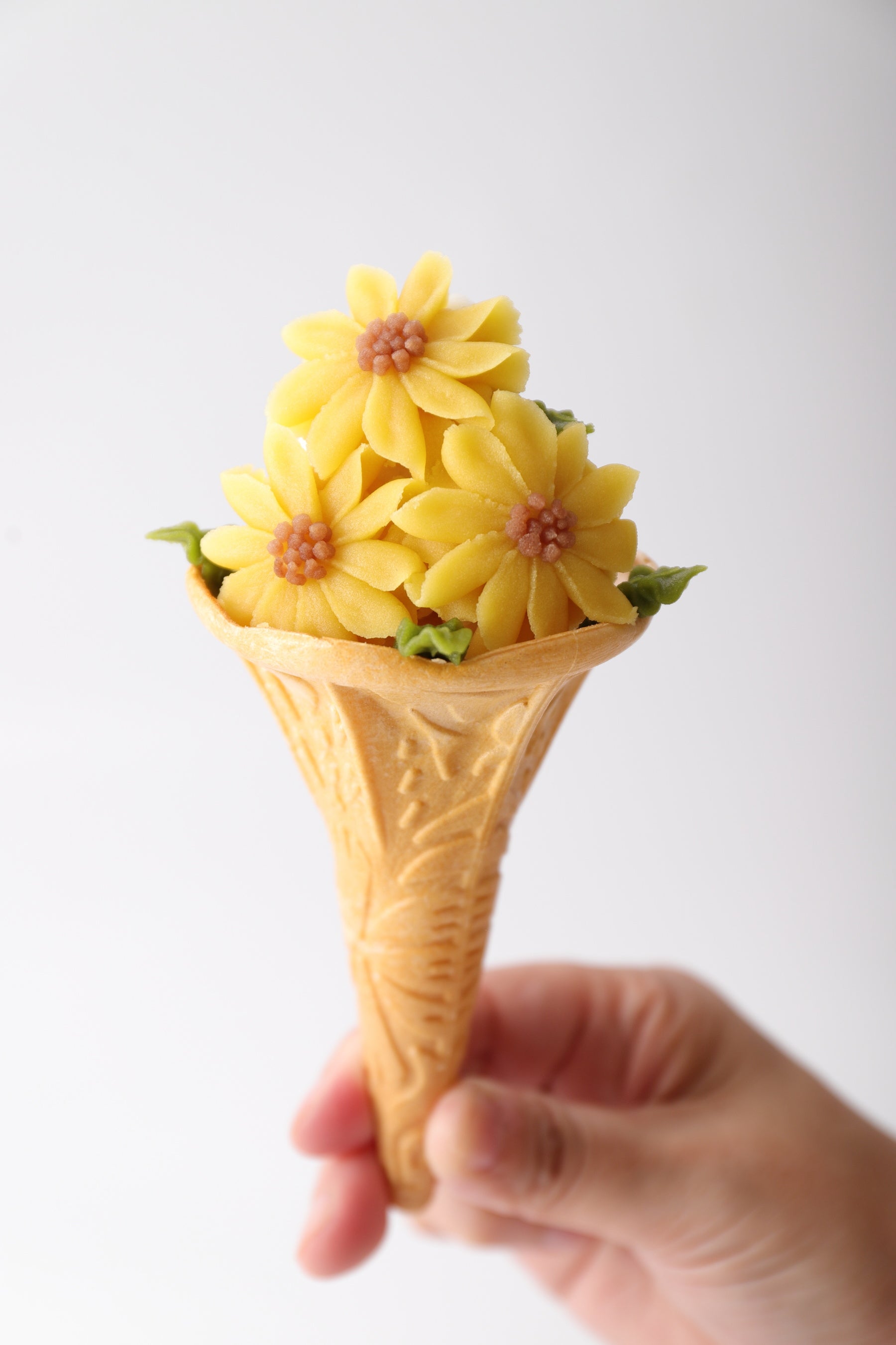 天然色素で色付けられた餡を使用して一輪ごと手絞りしたひまわりの花びらは、職人技が光る繊細な仕上がり。どこから見ても美しく、思わず写真を撮りたくなる可愛らしさです。夏の思い出に華を添え、SNSでも話題になること間違いなしです。