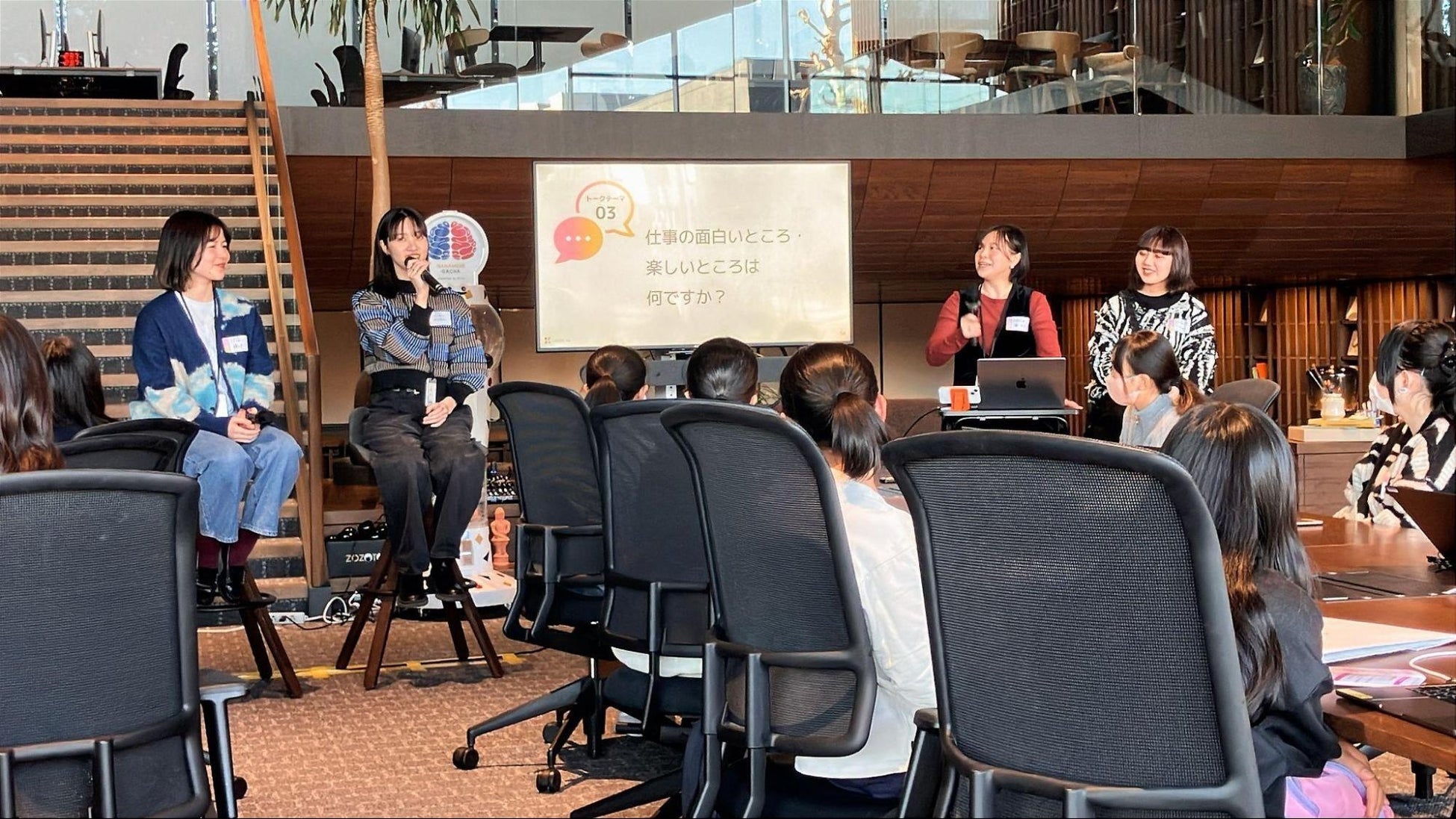 オフィスツアーやアイデアソンを行った後、ITエンジニアやコンサルタント、デザイナーといったさまざまな職種の女性社員との座談会を実施しました。
