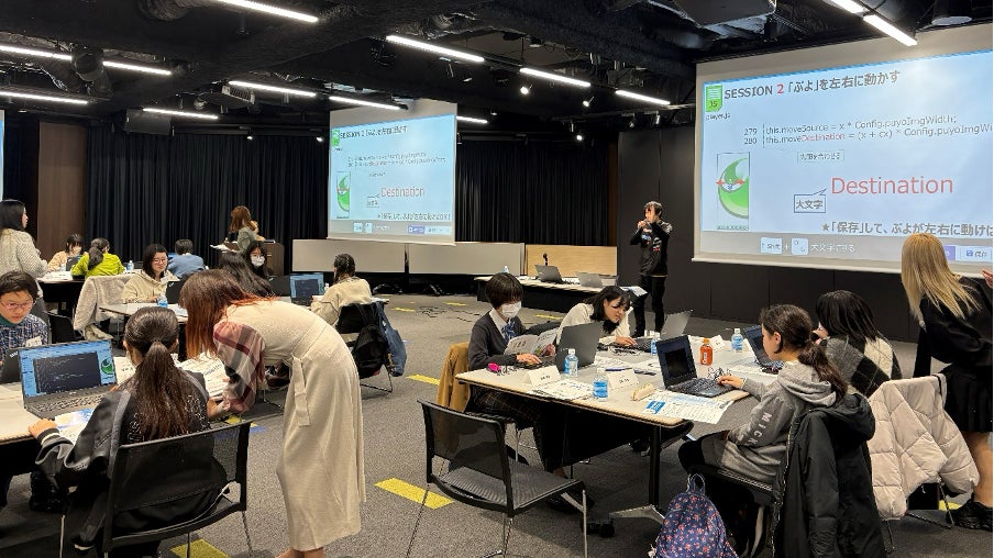 セガが展開するアクションパズルゲーム『ぷよぷよ』を使ったプログラミング講座と、 プログラマとしてゲーム開発に携わる女性社員との座談会、オフィスツアーを行いました。