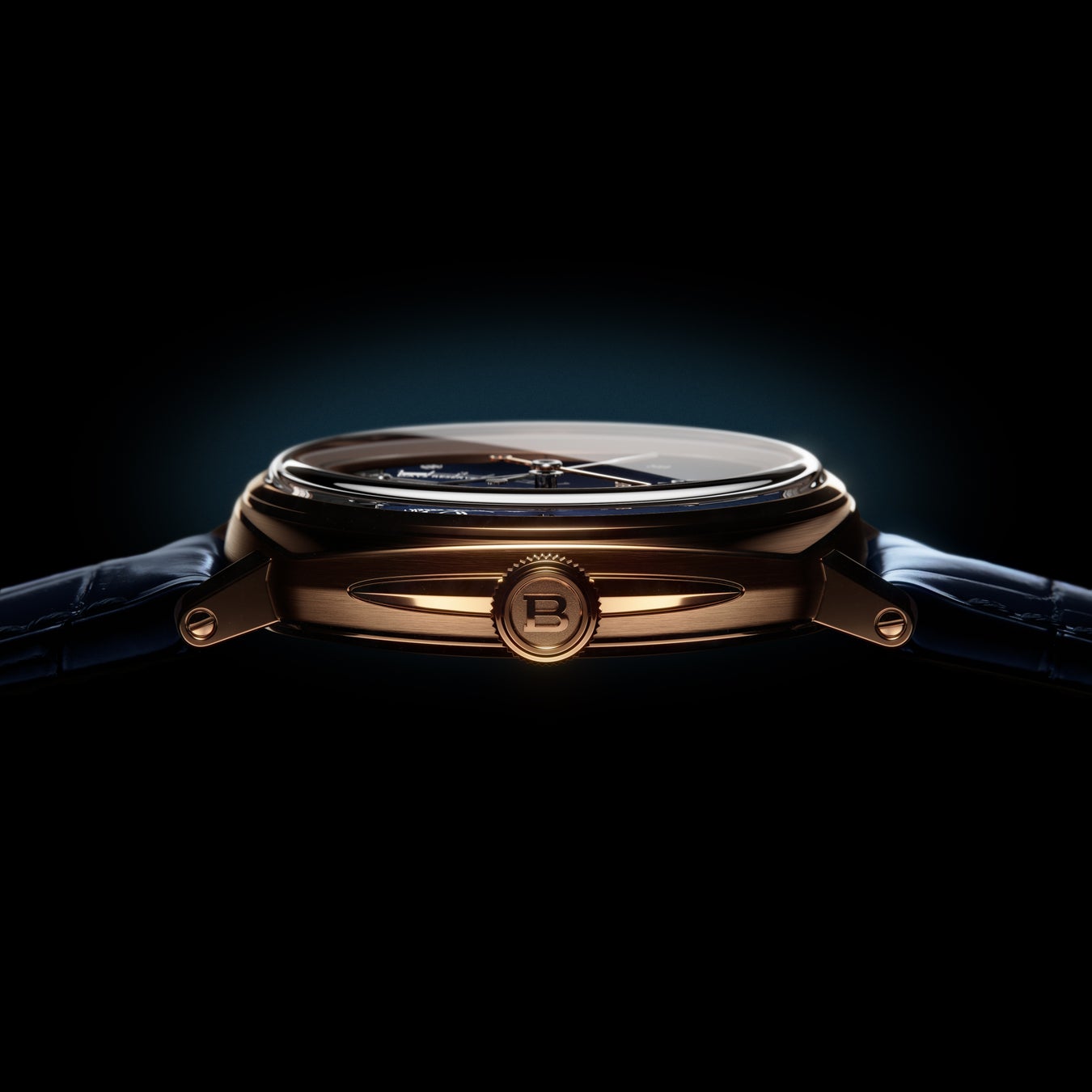 18K 5N+ ローズゴールド製のクッション型ケース(直径41mm/厚さ11.10mm)は、エレガントでありながらスポーティな印象を併せ持ち、50メートル防水を実現しています。
