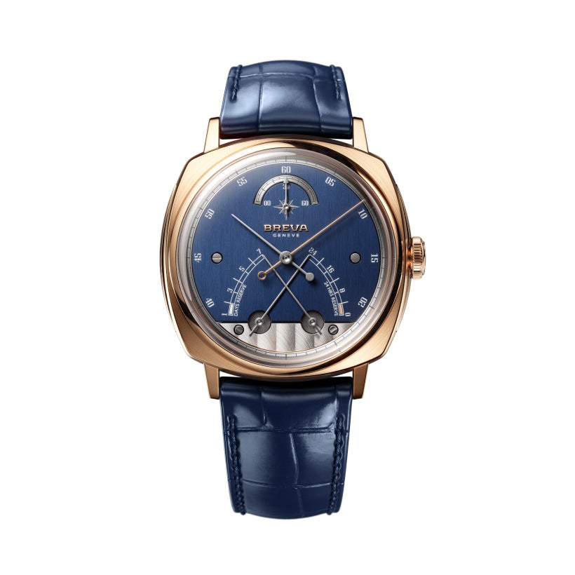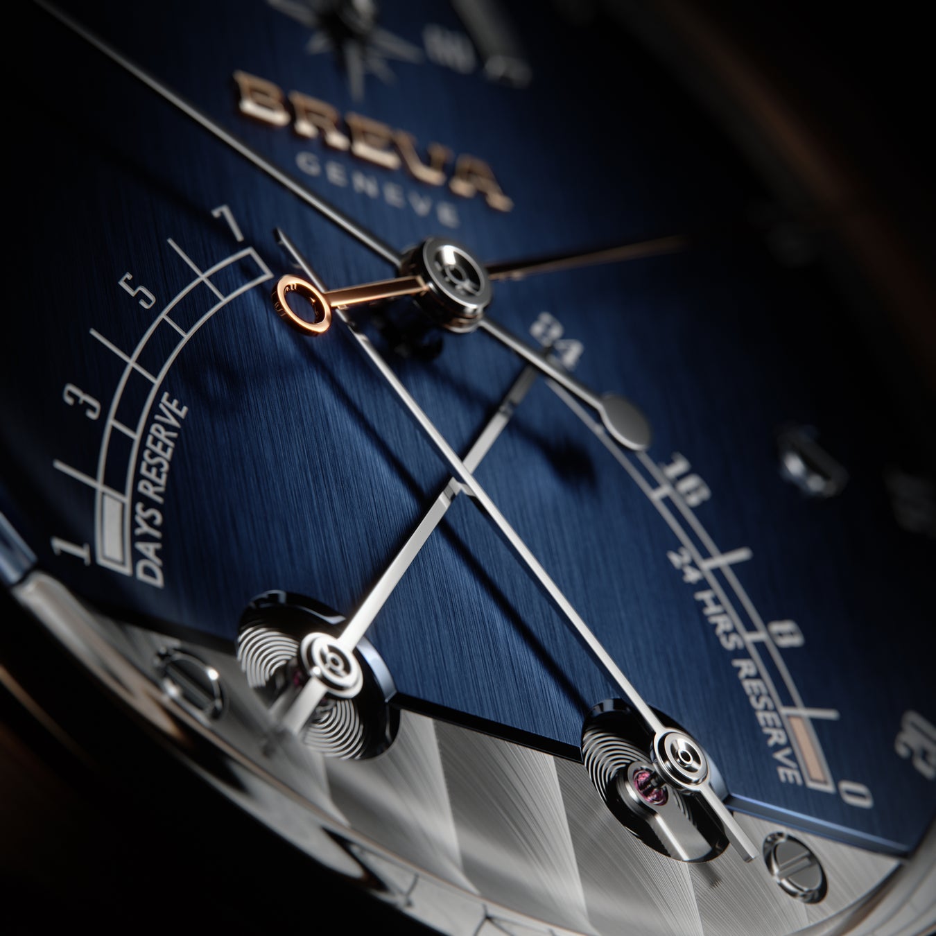 ムーブメントは、名匠 ジャン=フランソワ・モジョン率いるクロノード社によってBREVA専用に開発された手巻きキャリバー。