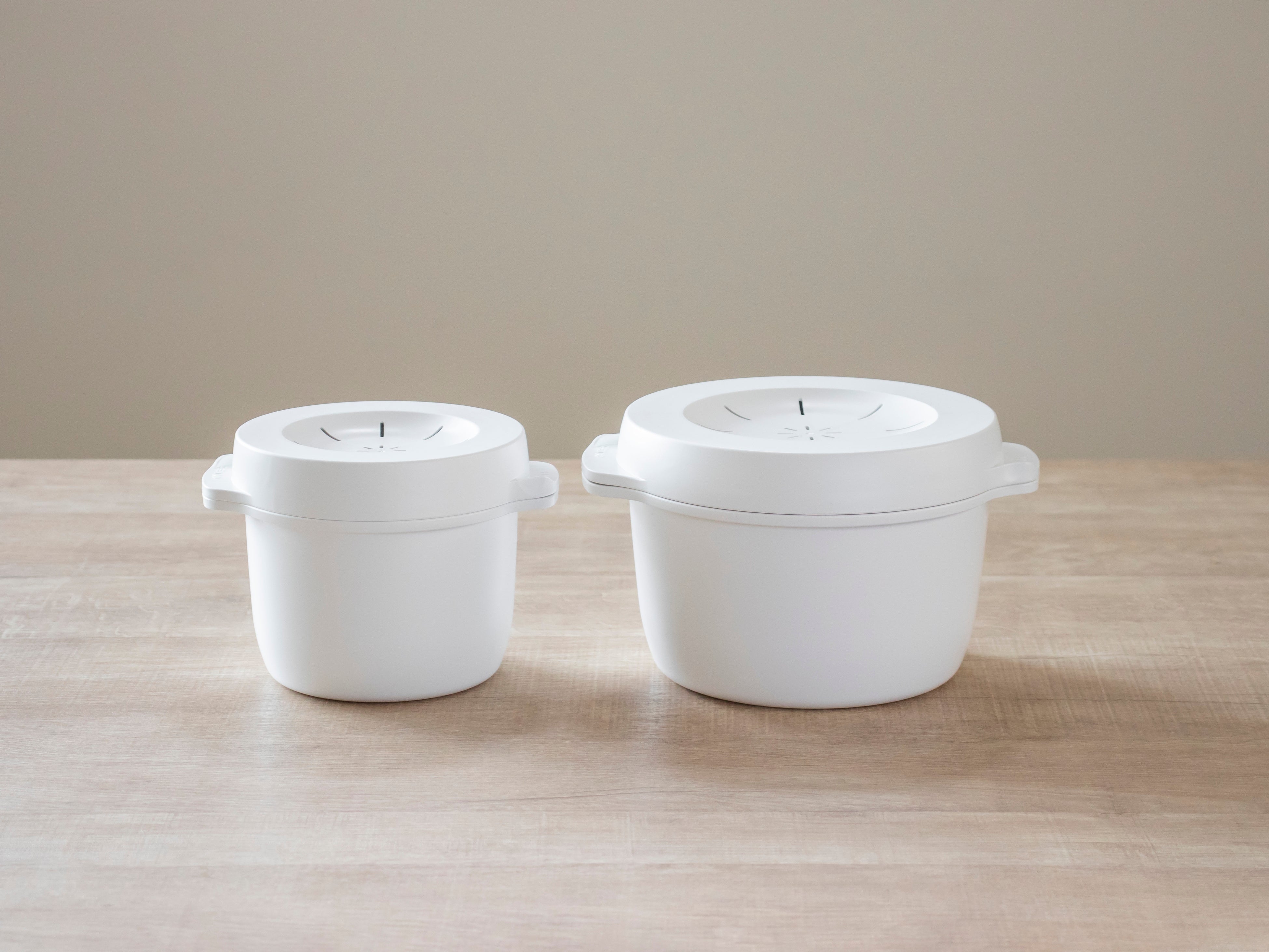 「スチームご飯メーカー」は、1合炊きと2合炊きの2サイズをご用意しました。一人暮らしにはコンパクトな1合タイプ、家族やまとめ炊きには2合タイプがおすすめ。用途に合わせて、ちょうどいいサイズをお選びいただけます。