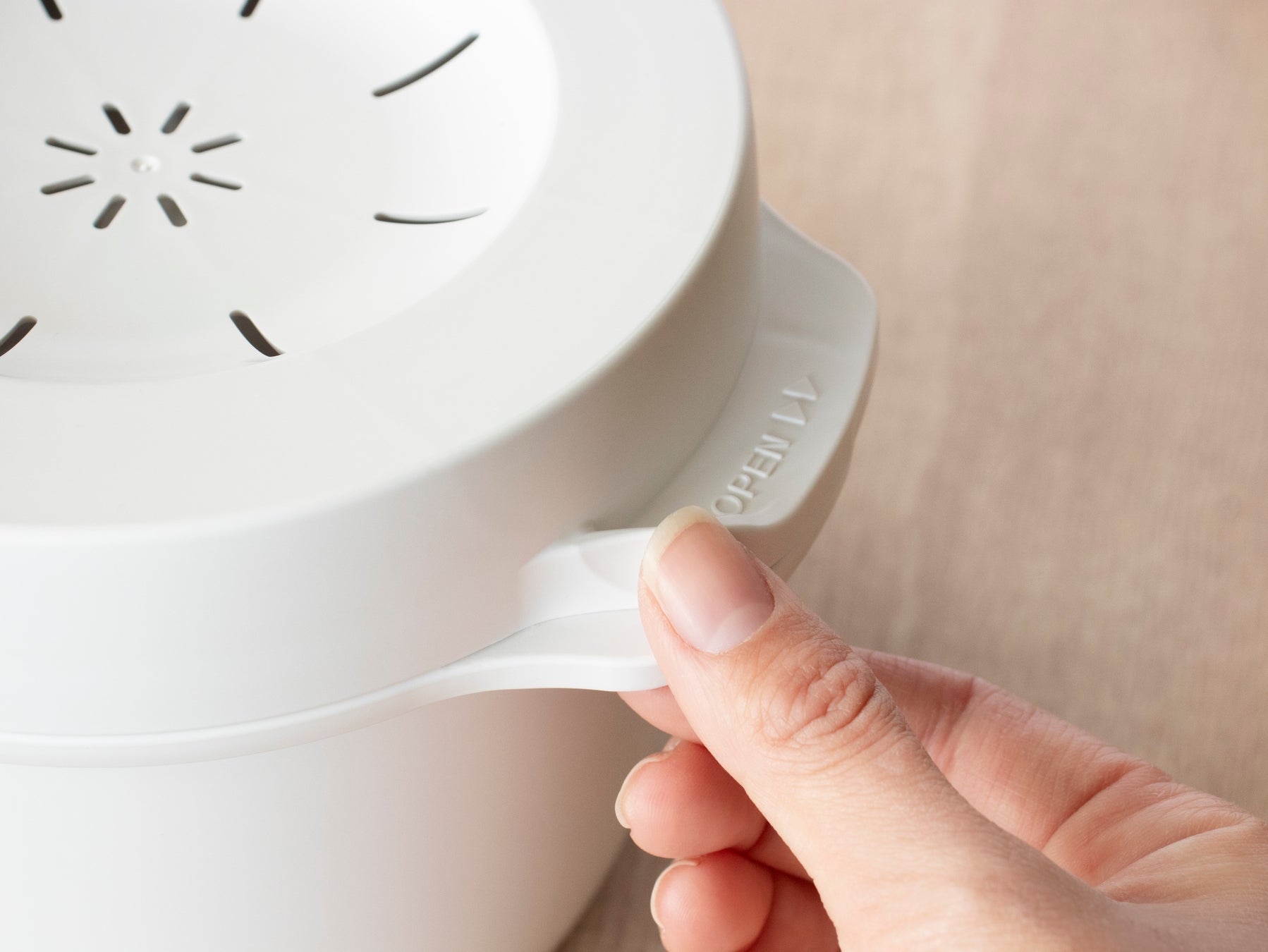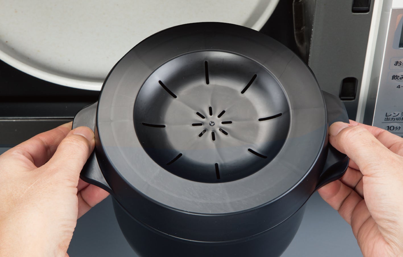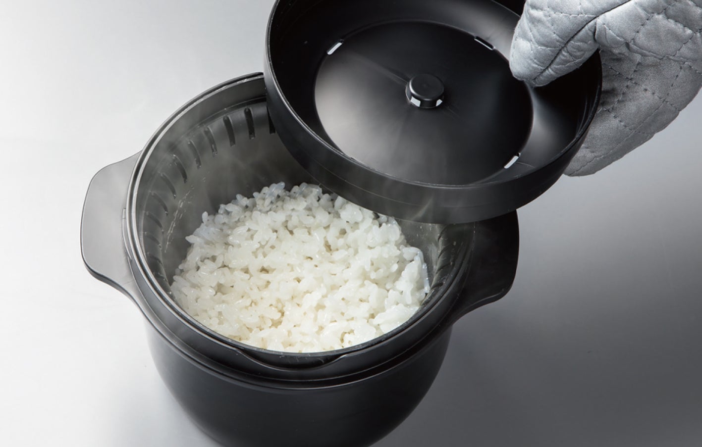 フタに指がひっかかる部分をつけて、開けやすくしました。細かなところまで使いやすさにこだわっています。火を使わずに安心して調理できる、電子レンジ専用のスチームご飯メーカー。ごはんから野菜、肉料理まで幅広く活躍し、毎日の食卓をぐっと豊かにしてくれます。