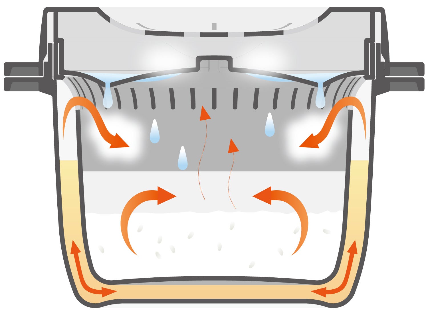 ●スチームを容器内で循環させ、米・野菜・肉を短時間でムラなく調理。
