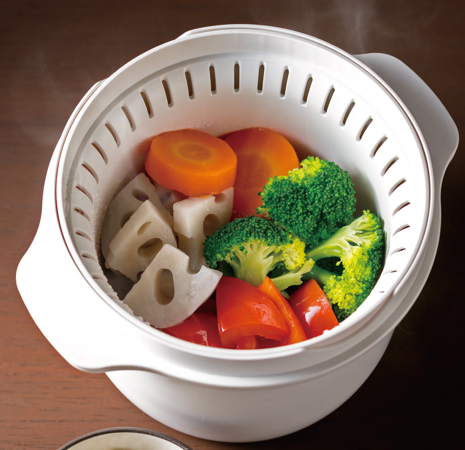 内容器と外容器の二重構造で蒸気が容器内を循環し、中の食材を包み込んで熱を加えることで、加熱ムラを抑えます。その結果、ごはんは粒立ちよく、野菜は甘く、肉はしっとり。食材全体がふっくらと仕上がります。