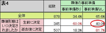 ・葬儀の事前準備に関する質問と上記3.葬儀形態の決定時期とを相関分析してみると、表4の通り、一定の相関はみられるものの、葬儀形態を「生前に決定」されていた方の4割が「事前準備をしていなかった」という結果も認められた