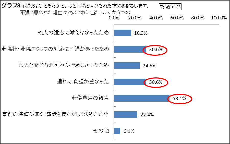 ② 「不満」と「どちらかと言うと不満」と回答された方に満足された理由を聞いたところ、グラフ8の通り、「葬儀費用の観点」が53.1%と半数以上の方が理由として挙げ、続いて「葬儀社・葬儀スタッフの対応に不満」と「遺族の負担が重かった」が同数の30.6%となっている