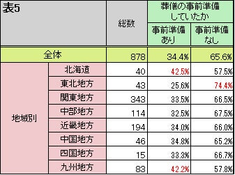 ・さらに、事前準備比率を地域別にみてみると、赤文字数値の通り、葬儀の形態で「一般葬」の比率が高かった「北海道と九州地方」では事前準備比率が高く、逆に事前準備比率が低いのは「東北地方」となっている