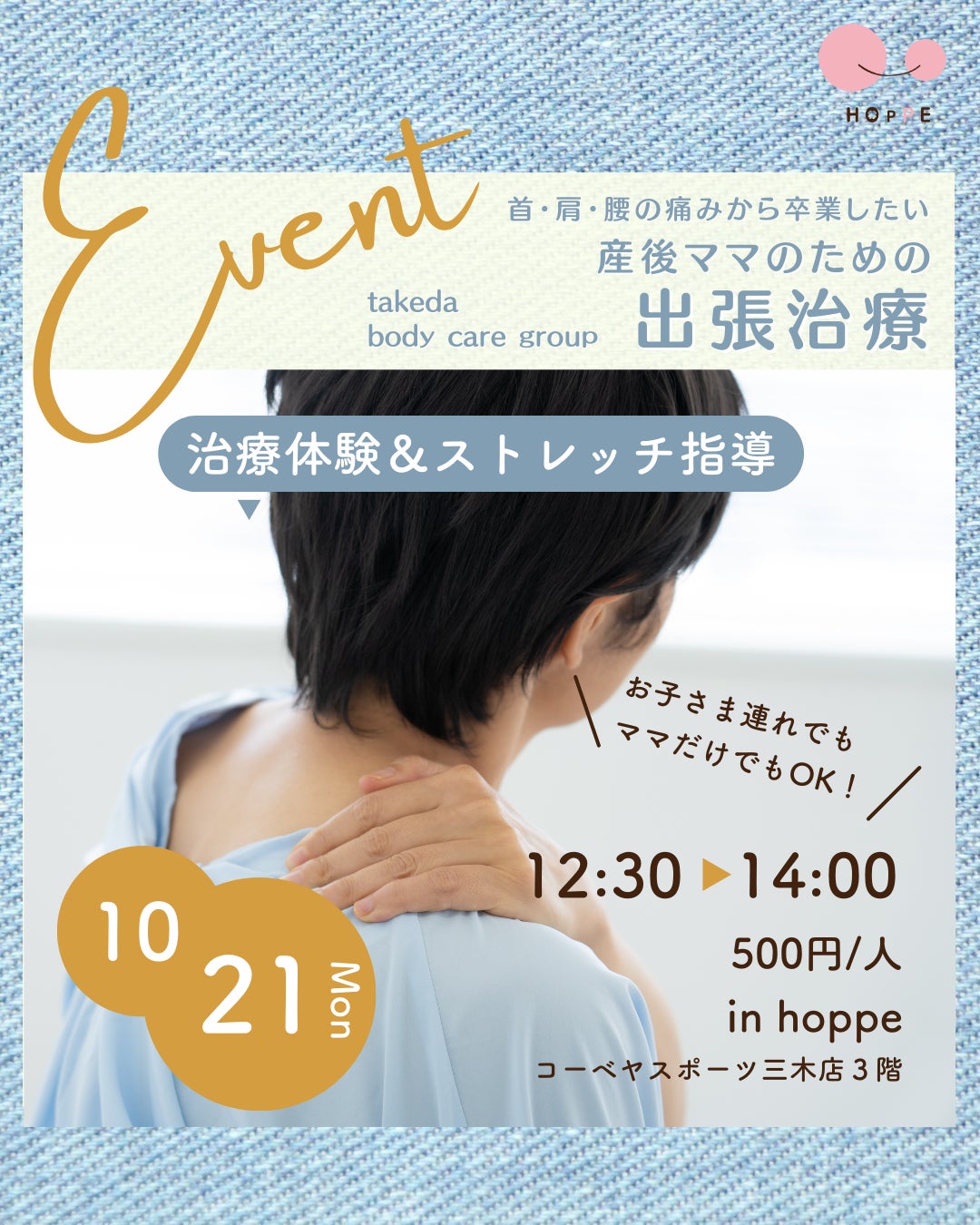特定非営利活動法人ほっぺ(代表:大森 奈津子)は、takedabody care groupさんをお招きし、2024年10月21日(月)hoppe(コーベヤスポーツ三木店3階)にて、『産後ママのための出張治療』を開催いたします。