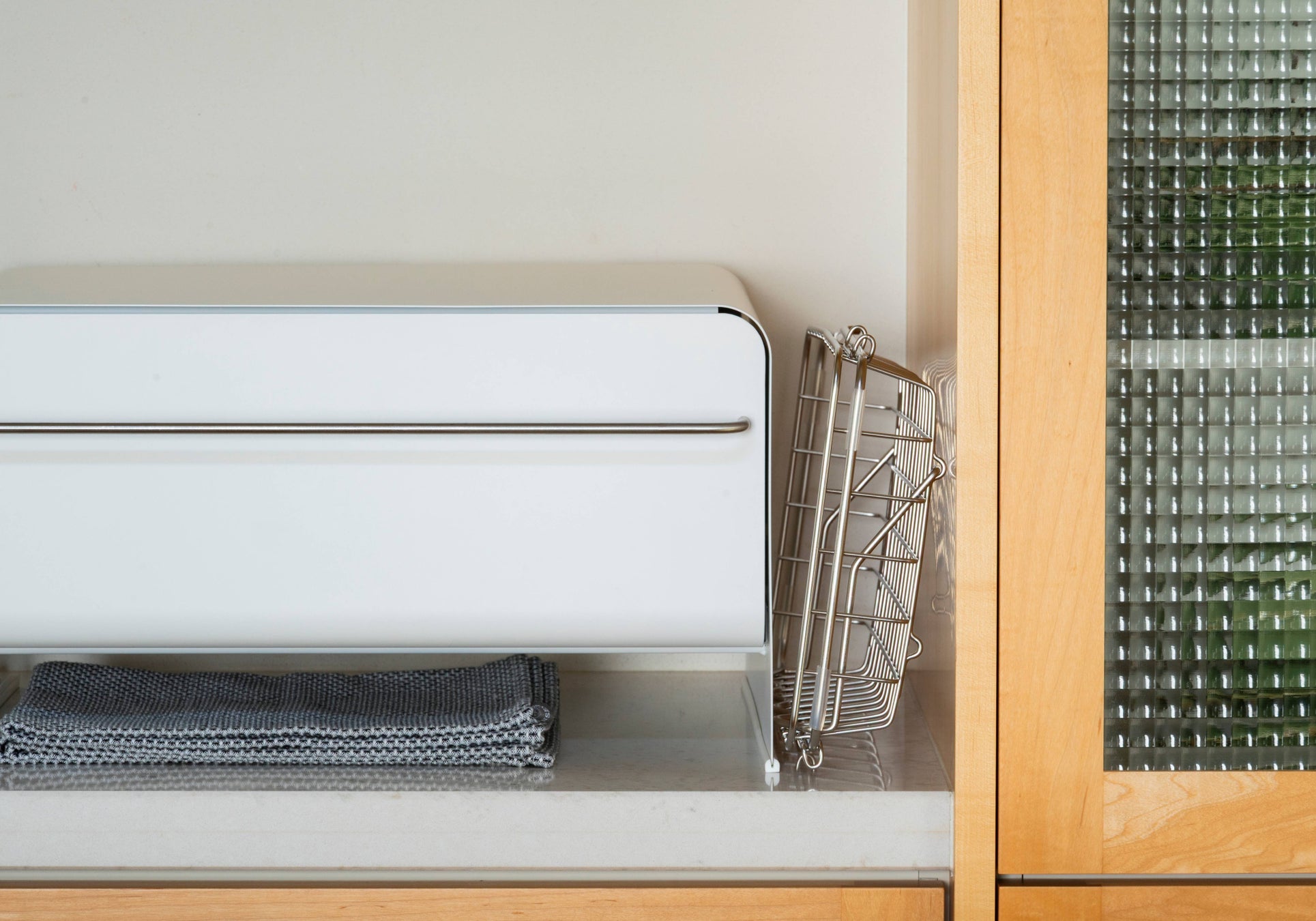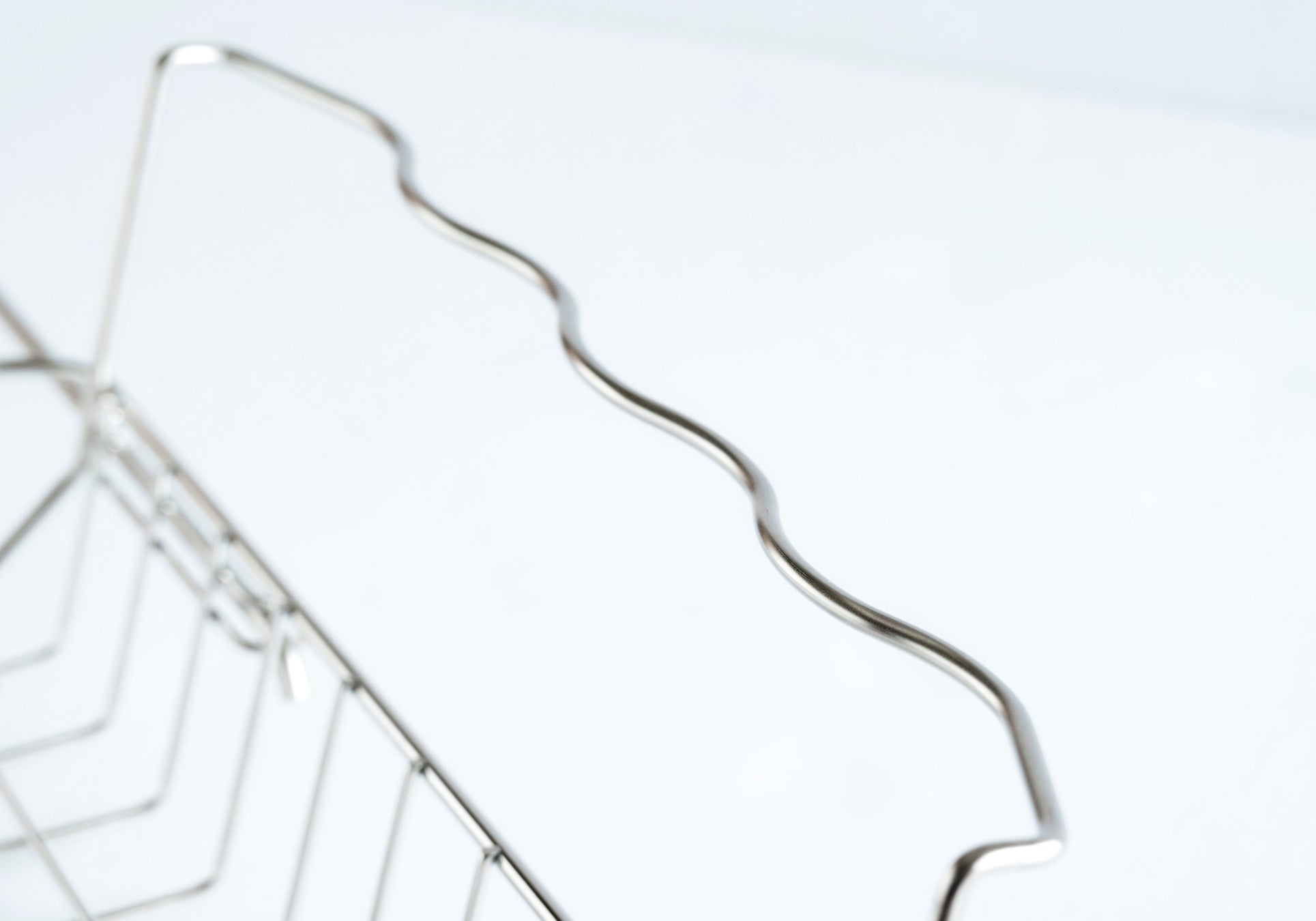 食器や水筒を立て掛けられる背もたれワイヤーには、波型形状を採用。ボトルの転がりを防ぎ、安定した水切りを実現します。未使用時には折りたたんで収納可能。折り畳めるため、隙間にも収まりやすい省スペース設計です。