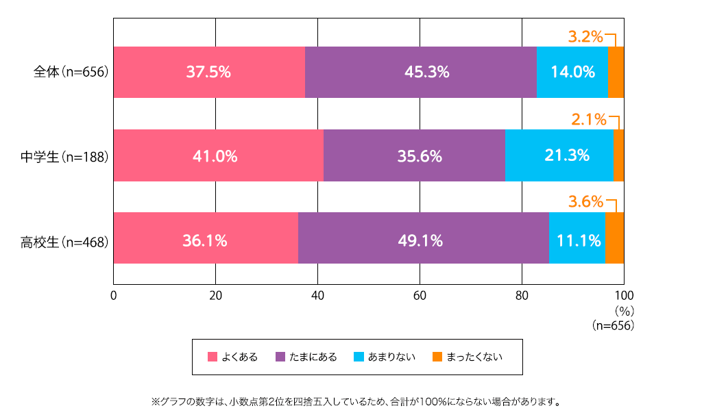 学校別では、中学生は「よくある」(41.0%)、「たまにある」(35.6%)をあわせると76.6%、高校生は「よくある」(36.1%)、「たまにある」(49.1%)をあわせると85.2%となり、中学生に比べて高校生のほうが、花粉症で勉強に集中できない経験頻度が多いという結果になりました。